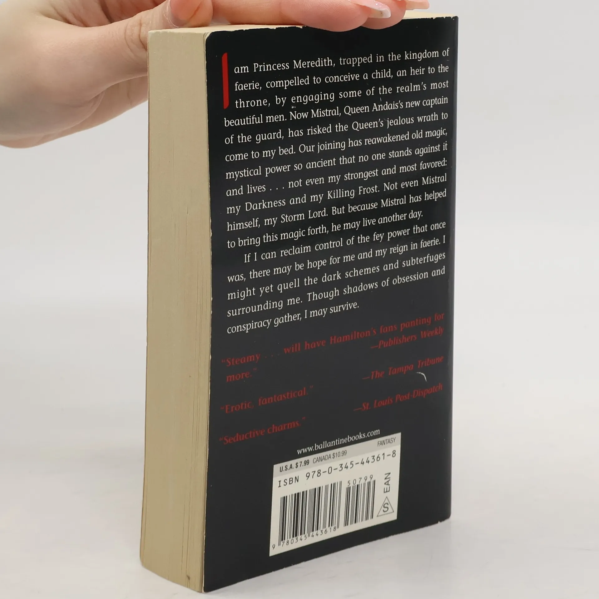 I am Princess Meredith, heir to a throne of faerie. My day job, once upon a time, was as a private detective in Los Angeles. Unfortunately, princess has now become a full-time occupation. My aunt, Queen Andais, will have it no other way. And so I am virtually a prisoner in faerie-trapped here with some of the realm's most beautiful men to serve as my bodyguards . . . and my lovers. For I am compelled to conceive a child: an heir to succeed me on the throne. Yet after months of amazing sex with my consorts, there is still no baby. And no baby means no throne. The only certainty is death at the hands of my cousin Cel, or his followers, if I fail to conceive. Now Mistral, Queen Andais's new captain of the guard, has come to my bed-defying her and risking her terrible wrath in doing so. But even she will hesitate to punish him in jealous rage, because our joining has reawakened old magic, mystical power so ancient that no one stands against it and survives. Not even my strongest and most favored: my Darkness and my Killing Frost. Not even Mistral himself, my Storm Lord. But because Mistral has helped to bring this magic forth, he may live another day. If I can reclaim control of the fey power that once was, there may be hope for me and my reign in faerie. I might yet quell the dark schemes and subterfuges surrounding me. Though shadows of obsession and conspiracy gather, I may survive. <i>From the Hardcover edition.</i>