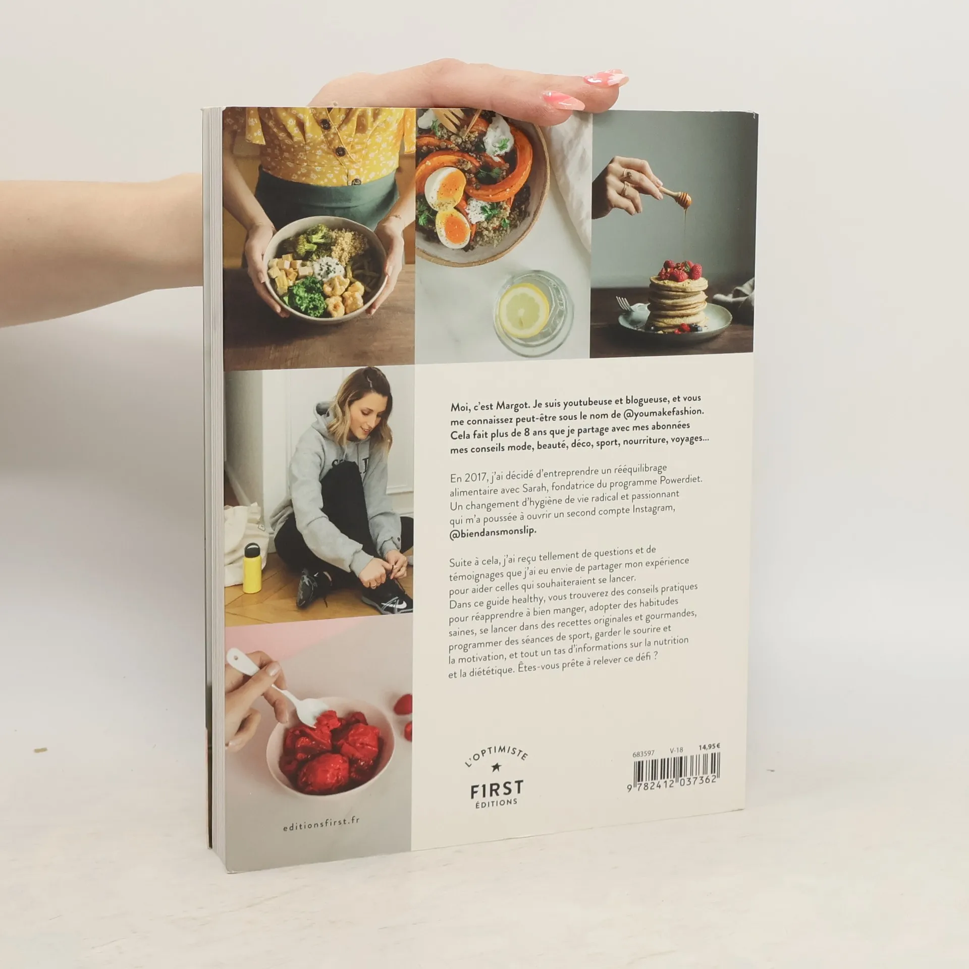 Je suis healthy !, c'est l'histoire du rééquilibrage alimentaire de Margot, du blog Youmakefashion !Moi, c'est Margot. Je suis youtubeuse et blogueuse, et vous me connaissez peut-être sous le nom de @youmakefashion. Cela fait plus de 8 ans que je partage avec mes abonnées mes conseils mode, beauté, déco, sport, nourriture, voyages...En 2017, j'ai décidé d'entreprendre un rééquilibrage alimentaire avec Sarah, fondatrice du programme Powerdiet. Un changement d'hygiène de vie radical et passionnant qui m'a poussée à ouvrir un second compte Instagram, @biendansmonslip. Suite à cela, j'ai reçu tellement de questions et de témoignages que j'ai eu envie de partager mon expérience pour aider celles qui souhaiteraient se lancer. Dans ce guide healthy, vous trouverez des conseils pratiques pour réapprendre à bien manger, adopter des habitudes saines, se lancer dans des recettes originales et gourmandes, programmer des séances de sport, garder le sourire et la motivation, et tout un tas d'informations sur la nutrition et la diététique. Êtes-vous prête à relever ce défi ?