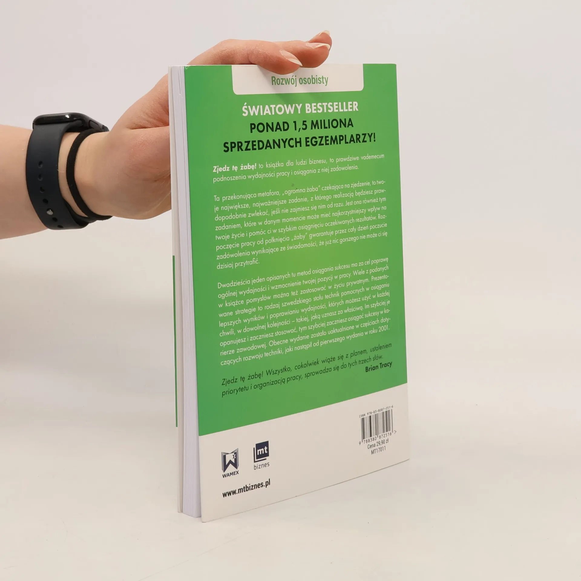 "Zjedz tę żabę! Wszystko, cokolwiek wiąże się z planem, ustaleniem priorytetu i organizacją pracy, sprowadza się do tych trzech słów." Brian Tracy "Zjedz tę żabę!" to książka dla ludzi biznesu, to prawdziwe vademecum podnoszenia wydajności w pracy i osiągania z niej zadowolenia. Ta przekonująca metafora, "ogromna żaba" czekająca na zjedzenie, to twoje największe, najważniejsze zadanie, z którego realizacją będziesz prawdopodobnie zwlekał, jeśli nie zajmiesz się nim od razu. Jest ona również tym zadaniem, które w danym momencie może mieć najkorzystniejszy wpływ na twoje życie i pomóc ci w szybkim osiągnięciu oczekiwanych rezultatów. Rozpoczęcie pracy od połknięcia żaby gwarantuje przez cały dzień poczucie zadowolenia wynikające ze świadomości, że już nic gorszego nie może ci się dzisiaj przytrafić. Dwadzieścia jeden opisanych tu metod osiągania sukcesu ma za cel poprawę ogólnej wydajności i wzmocnienie twojej pozycji w pracy. Wiele z podanych w książce pomysłów można też zastosować w życiu prywatnym. Prezentowane strategie to rodzaj szwedzkiego stołu technik pomocnych w osiąganiu lepszych wyników i poprawianiu wydajności, których możesz użyć w każdej chwili, w dowolnej kolejności – takiej, jaką uznasz za właściwą. Im szybciej je opanujesz i zaczniesz stosować, tym szybciej zaczniesz osiągać sukcesy w karierze zawodowej.