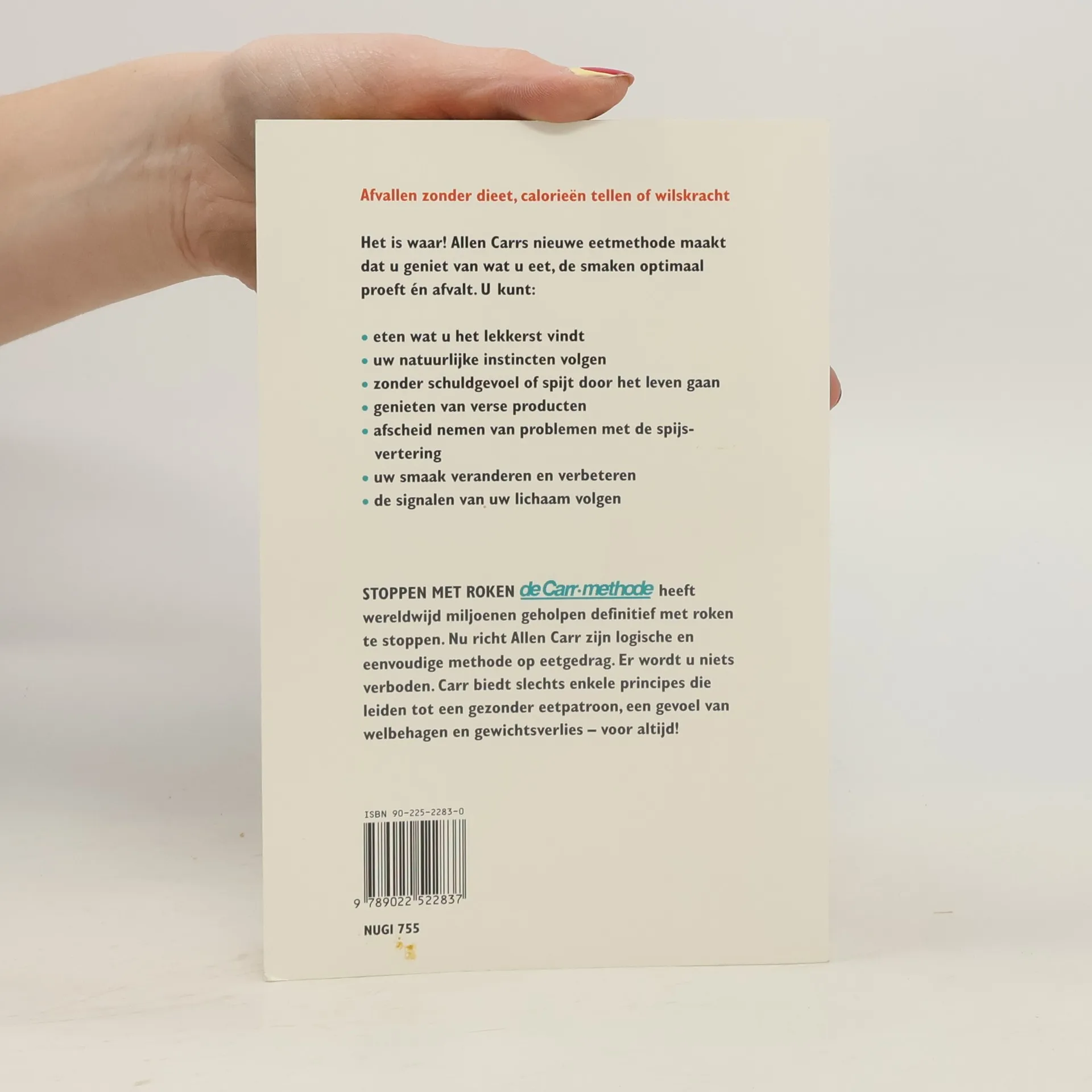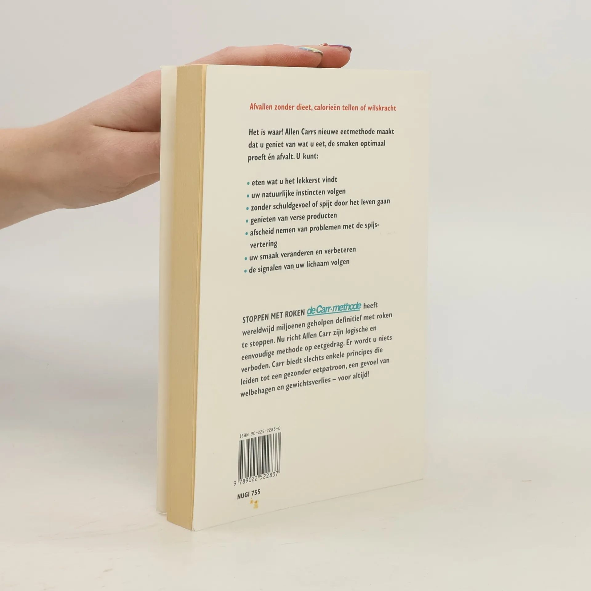 Afvallen zonder dieet, calorieën of wilskracht<br /><br />Het is waar! Allen Cars nieuwe eetmethode maakt dat u geniet van wat u eet, de smaken optimaal proeft én afvalt. U kunt:<br />- eten wat u het lekkerst vindt<br />- uw natuurlijke instincten volgen<br />- zonder schuldgevoel of spijt door het leven gaan<br />- genieten van verse producten<br />- afscheid nemen van problemen met de spijsvertering<br />- uw smaak veranderen en verbeteren<br />- de signalen van uw lichaam volgen<br /><br />Stoppen met Roken de Carr-methode heeft wereldwijd miljoenen geholpen definitief met roken te stoppen. Nu richt Allen Carr zijn logische en eenvoudige methode op eetgedrag. Er wordt u niets verboden. Carr biedt slechts enkele principes die leiden tot een gezonder eetpatroon, een gevoel van welbehagen en gewichtsverlies - voor altijd!