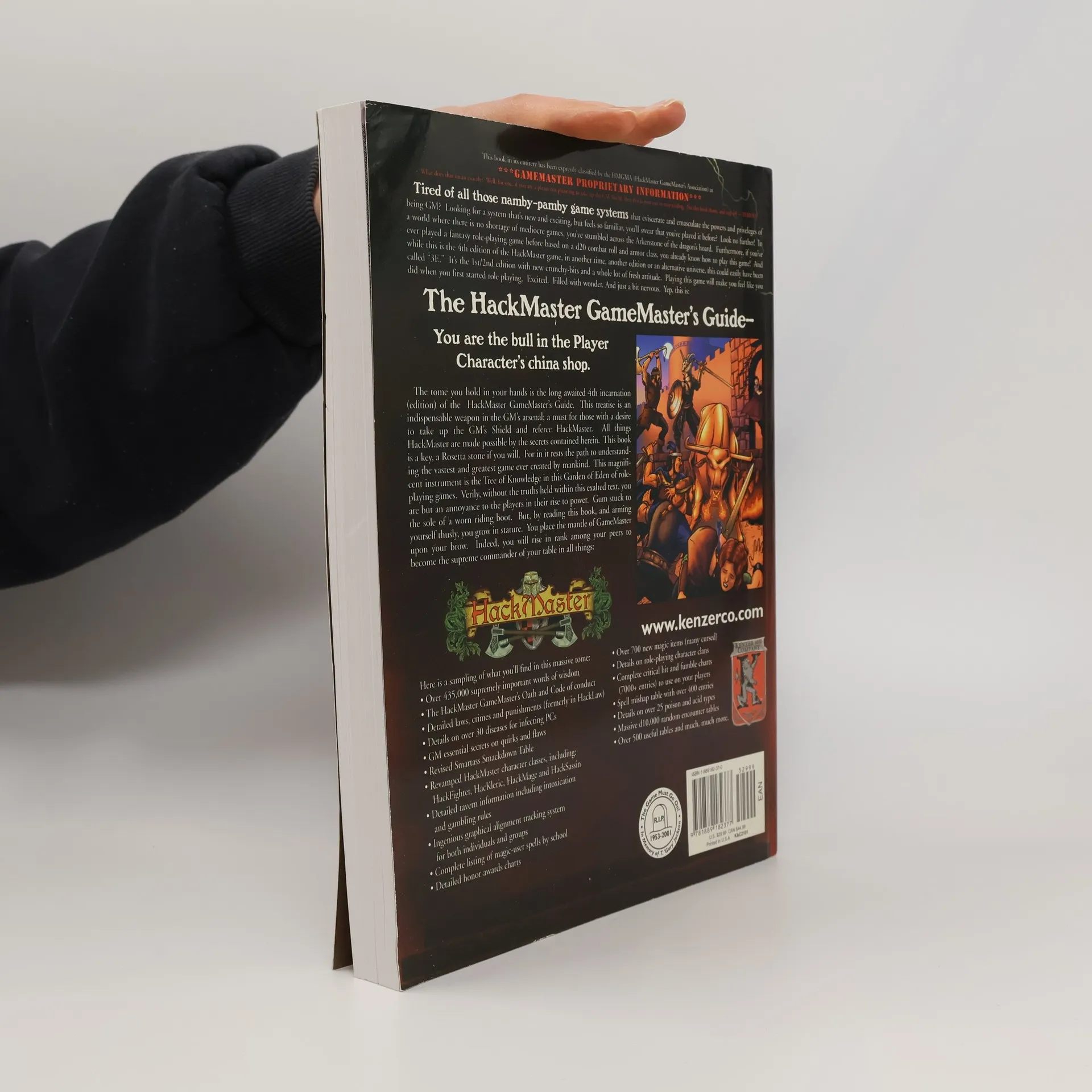 Tired of all those namby-pamby game systems that eviscerate and emasculate the powers and privileges of being GM? Looking for a system that's new and exciting, but feels so familiar, you'll swear that you've played it before? Look no further! In a world where there is no shortage of mediocre games, you've stumbled across the Arkenstone of the dragon's hoard. Furthermore, if you've ever played a fantasy role-playing game before based on a d20 combat roll and armor class, you already know how to play this game! And while this is the 4th edition of the HackMaster game, in another time, another edition or an alternative universe, this could easily have been called "3E." It's the 1st/2nd edition with new crunchy-bits and a whole lot of fresh attitude. Playing this game will make you feel like you did when you first started role-playing. Excited. Filled with wonder. And just a bit nervous.Here's a sampling of what you'll find in this massive tome:* Over 435,000 supremely important words of wisdom* The HackMaster GameMaster's Oath and Code of Conduct* Detailed laws, crimes and punishments (formerly in HackLaw)* Details on over 30 diseases for infecting PCs* GM essential secrets on quirks and flaws* Revised Smartass Smackdown Table* Revamped HackMaster character classes, including HackFighter, HacKleric, HackMage and HackSassin* Detailed tavern information including intoxication and gambling rules* Ingenious graphical alignment tracking system for both individuals and groups* Complete listing of magic-user spells by school* Detailed honor awards chart* Over 700 new magic items (many cursed)* Details on role-playin character clans* Complete critical hit and fumble charts (7000+ entries) to use on your players* Spell mishap table with over 400 entries* Details on over 25 poison and acid types* Massive d10,000 random encounter tables* Over 500 useful tables and much, much more.