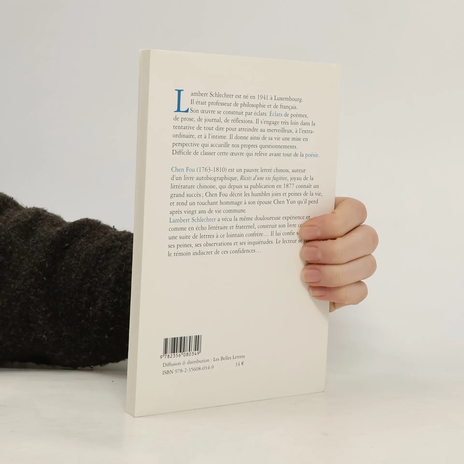 Chen Fou (1763-1810) est un pauvre lettré chinois, auteur d'un livre autobiographique, Récits d'une vie fugitive, joyau de la littérature chinoise, qui depuis sa publication en 1877 connaît un grand succès ; Chen Fou décrit les humbles joies et peines de la vie, et rend un touchant hommage à son épouse Chen Yun qu'il perd après vingt ans de vie commune. Lambert Schlechter a vécu la même douloureuse expérience et, comme en écho littéraire et fraternel, construit son livre comme une suite de lettres à ce lointain confrère... Il lui confie ses joies et ses peines, ses observations et ses inquiétudes. Le lecteur se trouve le témoin indiscret de ces confidences...