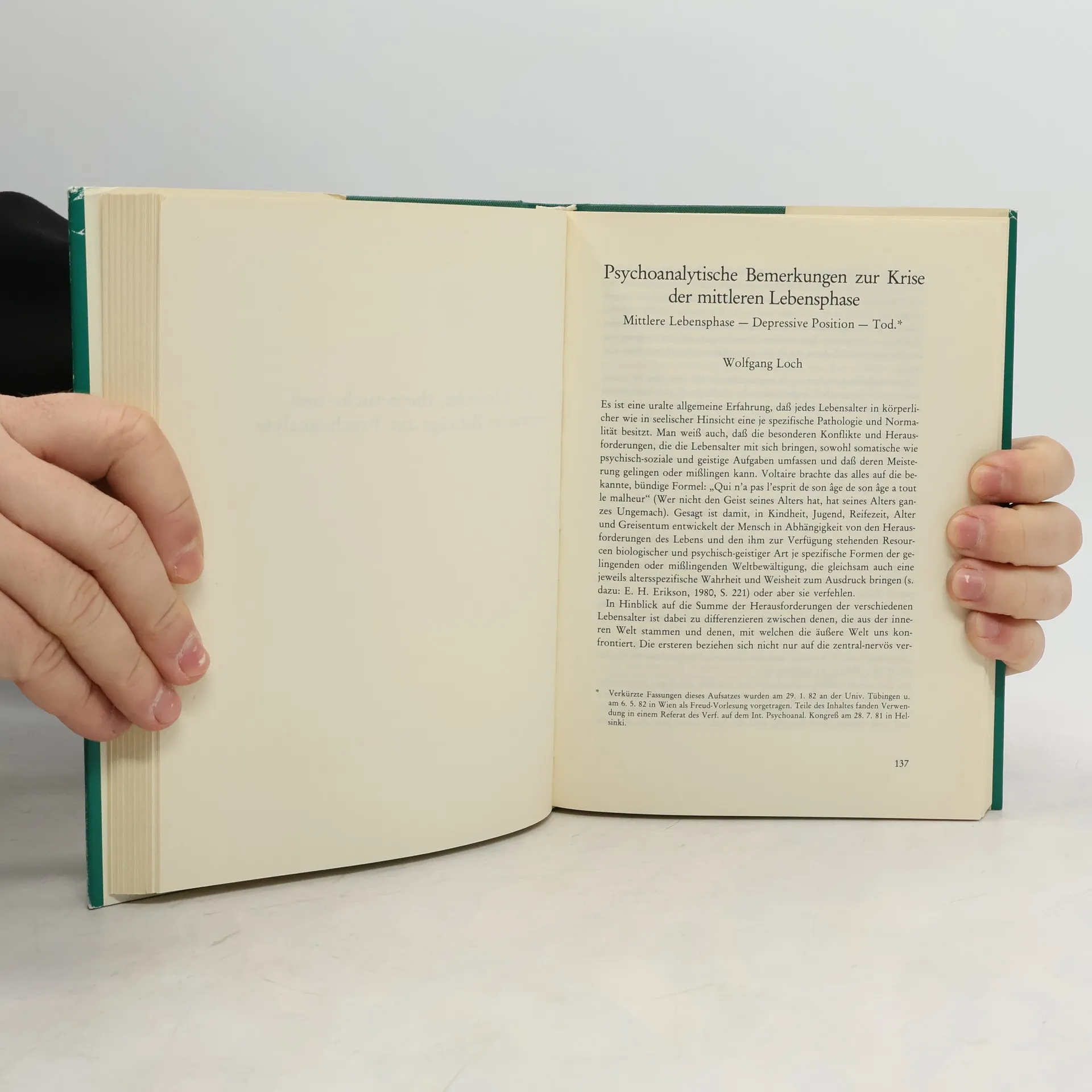 A. Freud: Dankgruss an die Universitat Frankfurt - BEITRAGE ANLAssLICH DES 80. GEBURTSTAGS VON ERICH SIMENAUER: H. Beland: Der wissenschaftliche Beitrag Erich Simenauers zur Psychoanalyse - E. Simenauer: Zur Problematik des Narzissismus - E. Simenauer: Vom Paricidium zum Patricidium - G. Pankow: Korperbild, Ubergangsobjekt und Narzissmus - E. Hinze: Probleme einer nosologischen Klassifikation in der Psychoanalyse - U. Ehebald: Psychoanalyse heute - KLINISCHE, THEORETISCHE UND HISTORISCHE BEITRAGE: W. Loch: Psychoanalytische Bemerkungen zur Krise der mittleren Lebensphase - A. Haynal: Die Analyse des Traumes und der psychoanalytische Prozess - U. Grunert: Selbstdarstellung und Selbstentwicklung im manifesten Traum - S. Stephanos: Der Herzinfarkt und seine Behandlung als analytisch-psychosomatische Aufgabe - S. L. Gilman: Das mannliche Stereotyp von der weiblichen Sexualitat im Wiener Fin de Siecle - V. Tahka: Psychotherapie als phasenspezifische Interaktion.
