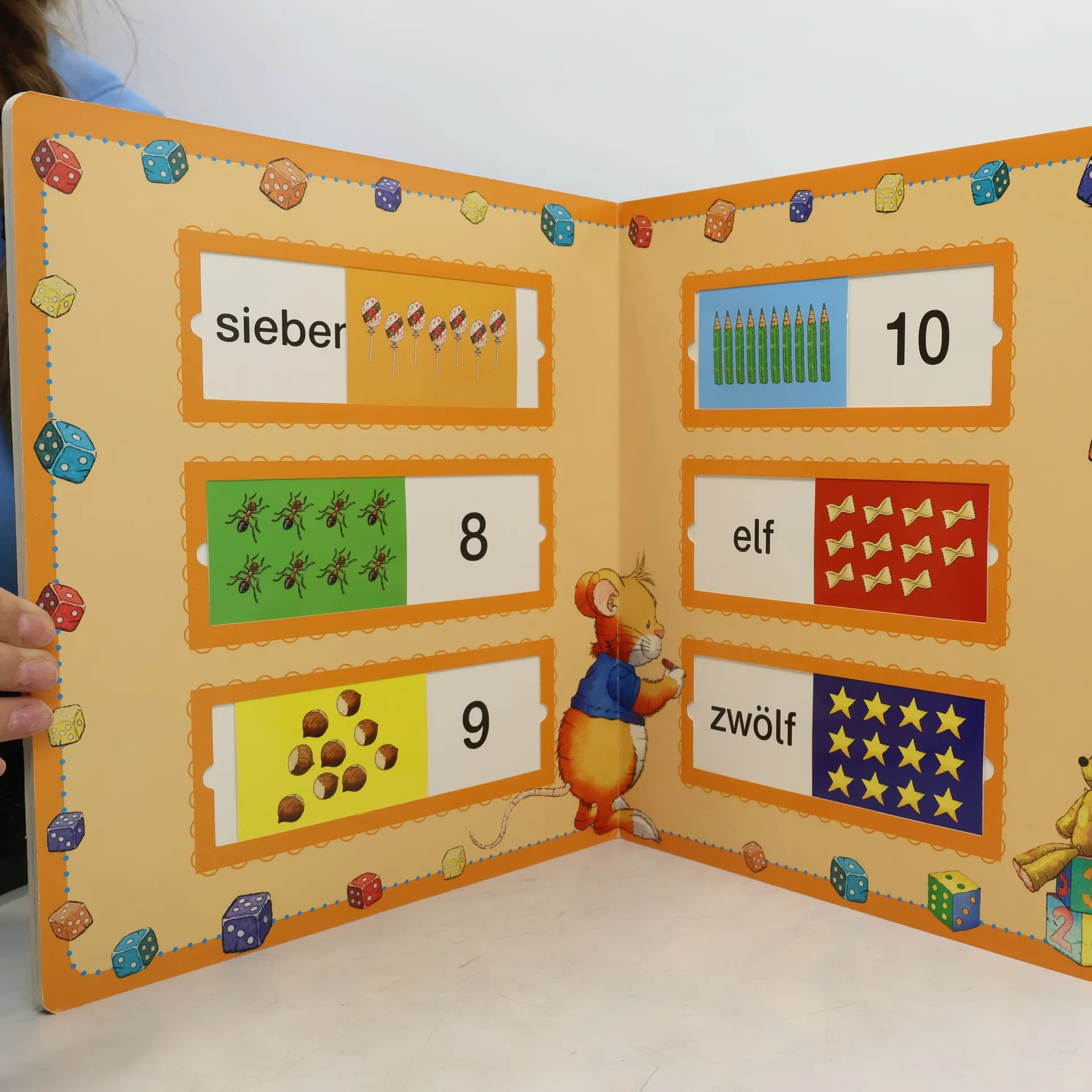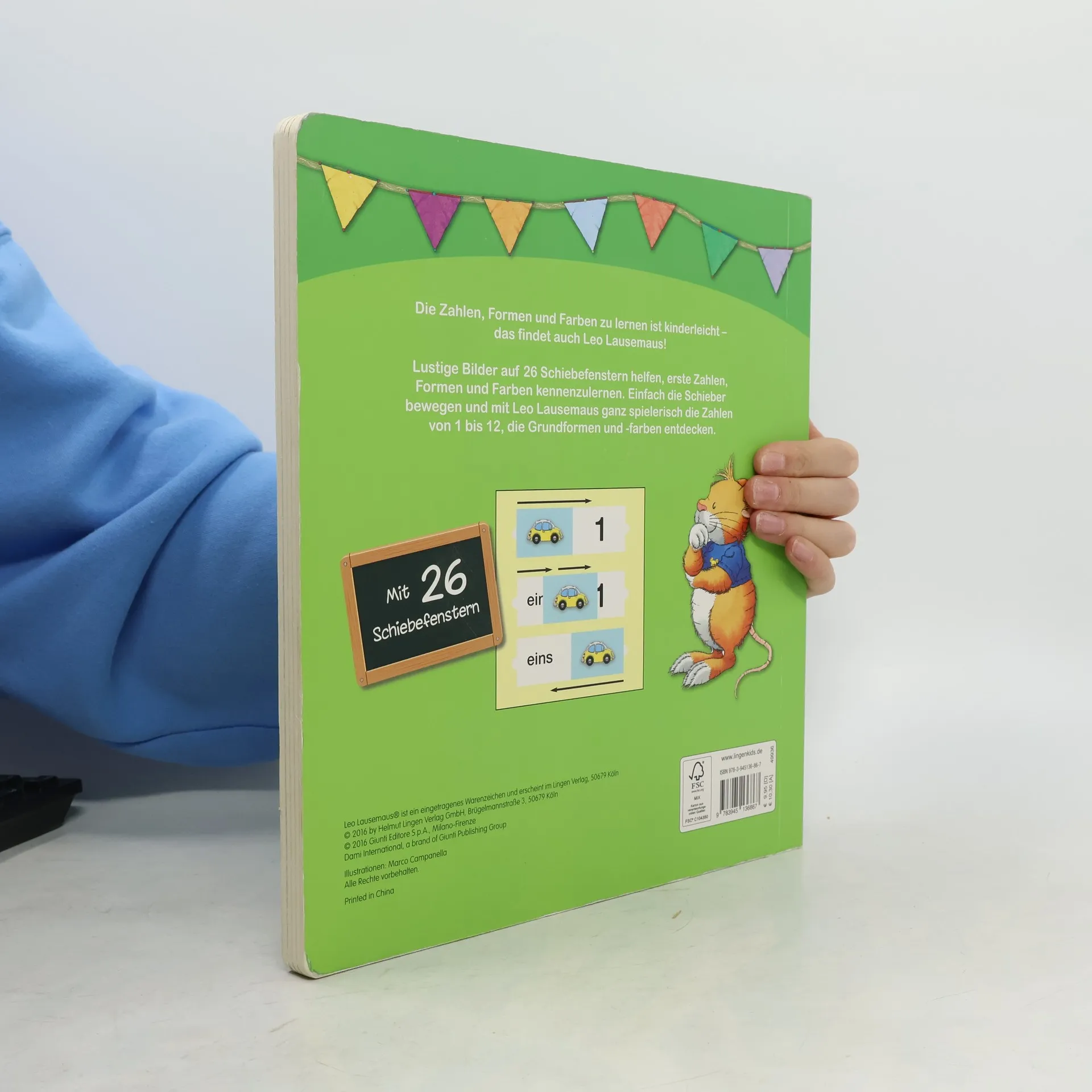 „Die Zahlen, Formen und Farben zu lernen ist kinderleicht – das findet auch Leo Lausemaus! Lustige Bilder auf 26 Schiebetafeln helfen, erste Zahlen, Formen und Farben kennenzulernen. Einfach die Schieber bewegen und mit Leo Lausemaus ganz spielerisch die Zahlen von 1 bis 12, die Grundformen und -farben entdecken.“