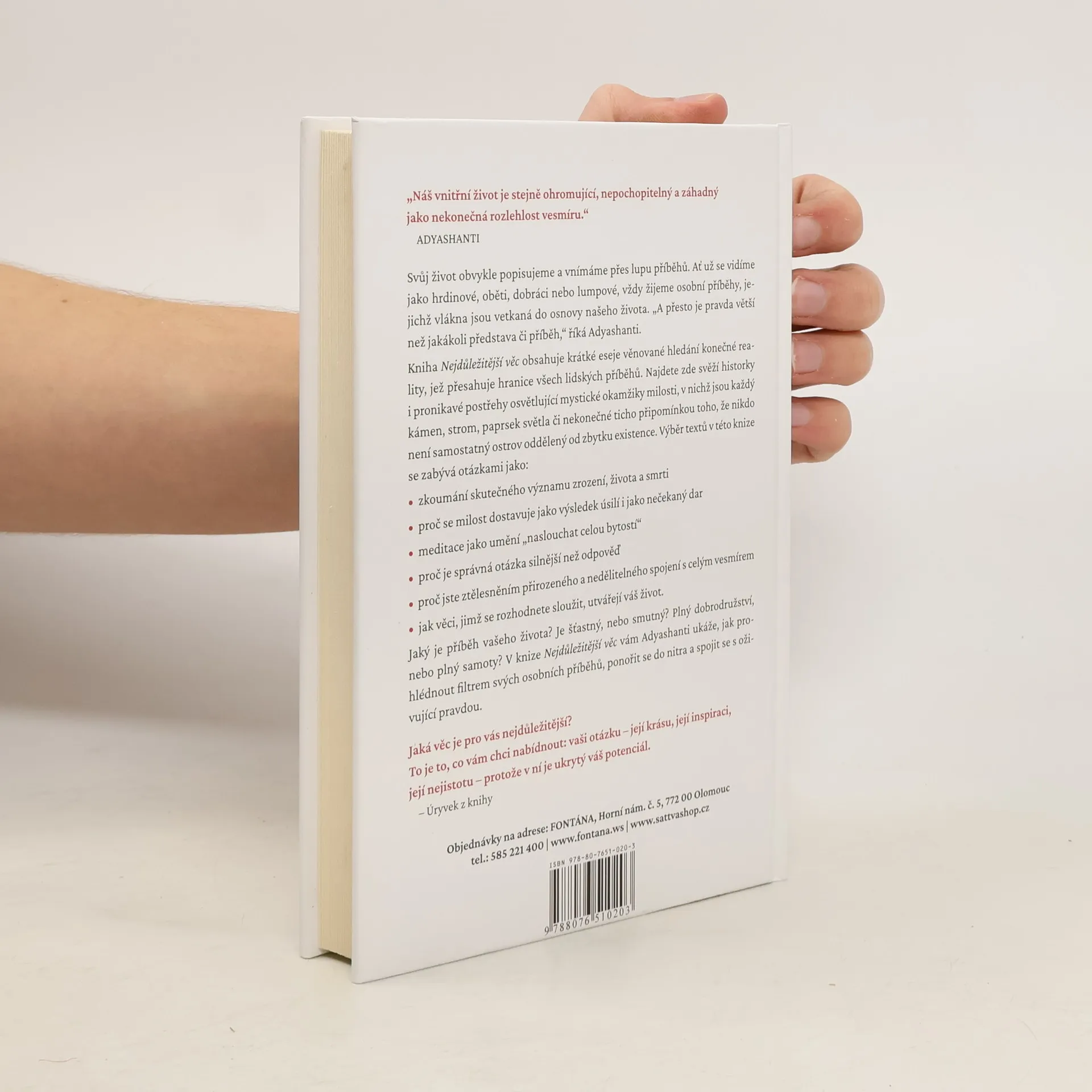 Svůj život obvykle popisujeme a vnímáme přes lupu příběhů. Ať už se vidíme jako hrdinové, oběti, dobráci nebo lumpové, vždy žijeme osobní příběhy, jejichž vlákna jsou vetkaná do osnovy našeho života. „A přesto je pravda větší než jakákoli představa či příběh,“ říká Adyashanti. Kniha Nejdůležitější věc obsahuje krátké eseje věnované hledání konečné reality, jež přesahuje hranice všech lidských příběhů. Najdete zde svěží historky i pronikavé postřehy osvětlující mystické okamžiky milosti, v nichž jsou každý kámen, strom, paprsek světla či nekonečné ticho připomínkou toho, že nikdo není samostatný ostrov oddělený od zbytku existence. Výběr textů v této knize se zabývá otázkami jako: • zkoumání skutečného významu zrození, života a smrti • proč se milost dostavuje jako výsledek úsilí i jako nečekaný dar • meditace jako umění „naslouchat celou bytostí“ • proč je správná otázka silnější než odpověď • proč jste ztělesněním přirozeného a nedělitelného spojení s celým vesmírem • jak věci, jimž se rozhodnete sloužit, utvářejí váš život. Jaký je příběh vašeho života? Je šťastný, nebo smutný? Plný dobrodružství, nebo plný samoty? V knize Nejdůležitější věc vám Adyashanti ukáže, jak prohlédnout filtrem svých osobních příběhů, ponořit se do nitra a spojit se s oživující pravdou. Jaká věc je pro vás nejdůležitější? „Náš vnitřní život je stejně ohromující, nepochopitelný a záhadný jako nekonečná rozlehlost vesmíru.“