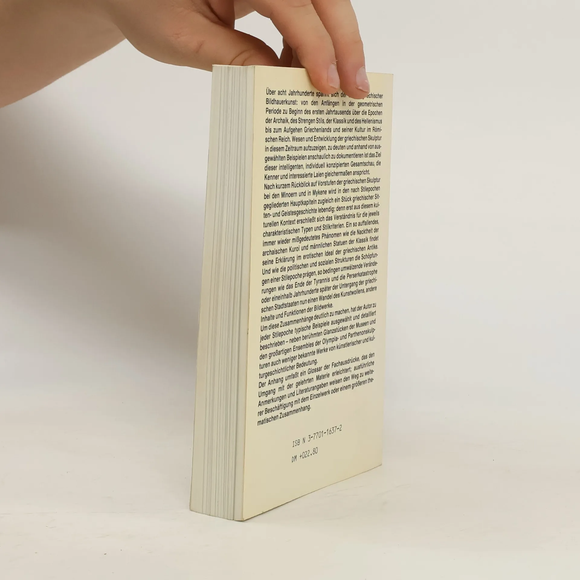 Reich illustrierter Überblick über die Entwicklung der griechischen Bildhauerkunst von den Anfängen zu Beginn des ersten Jahrtausends bis zum späten Hellenismus; mit zahlreichen Einzelbeschreibungen bedeutender Skulpturen
