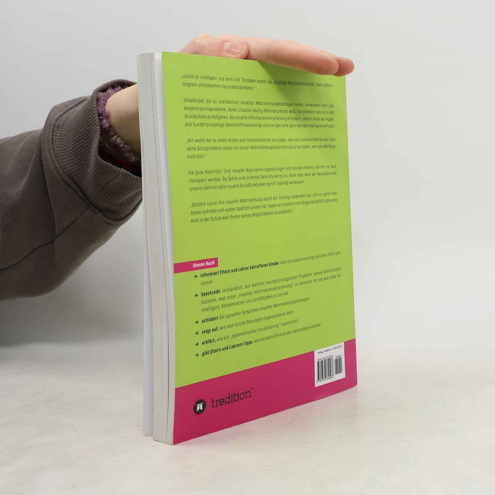 Laura ist intelligent, lernt viel, hat jedoch zahlreiche Rechtschreibfehler, liest langsam und erhält schlechte Noten. Viele Schulkinder mit unerkannten visuellen Wahrnehmungsstörungen entwickeln Lern- und Konzentrationsprobleme, oft missverstanden. Sie scheitern bereits in der Grundschule an Aufgaben, die visuelle Informationsverarbeitung erfordern, obwohl ihre Sehkraft einwandfrei ist und sie normal intelligent sind. Eltern berichten von zahlreichen Arztbesuchen, ohne eine Erklärung für die Schulprobleme ihres Kindes zu erhalten. Die gute Nachricht: Sind visuelle Wahrnehmungsstörungen erkannt, können sie therapiert werden. Dank der Neuroplastizität des Gehirns können viele visuelle Grundfunktionen durch Training verbessert werden. Nachdem Laura ihre visuelle Wahrnehmung verbessert hat, liest sie gerne, schreibt besser und hat wieder Freude am Lernen. Dieses Buch informiert Eltern und Lehrer über die Zusammenhänge zwischen Sehen und Lernen, beschreibt die neurophysiologischen Prozesse hinter unseren Sehfunktionen und erklärt, was unter "visueller Informationsverarbeitung" zu verstehen ist. Es schildert typische Symptome visueller Verarbeitungs- und Wahrnehmungsstörungen (VVWS), zeigt Diagnoseschritte auf, erklärt das Konzept des optometrischen Visualtrainings und bietet praktische Tipps, wie Eltern und Lehrer betroffene Kinder unterstützen können.