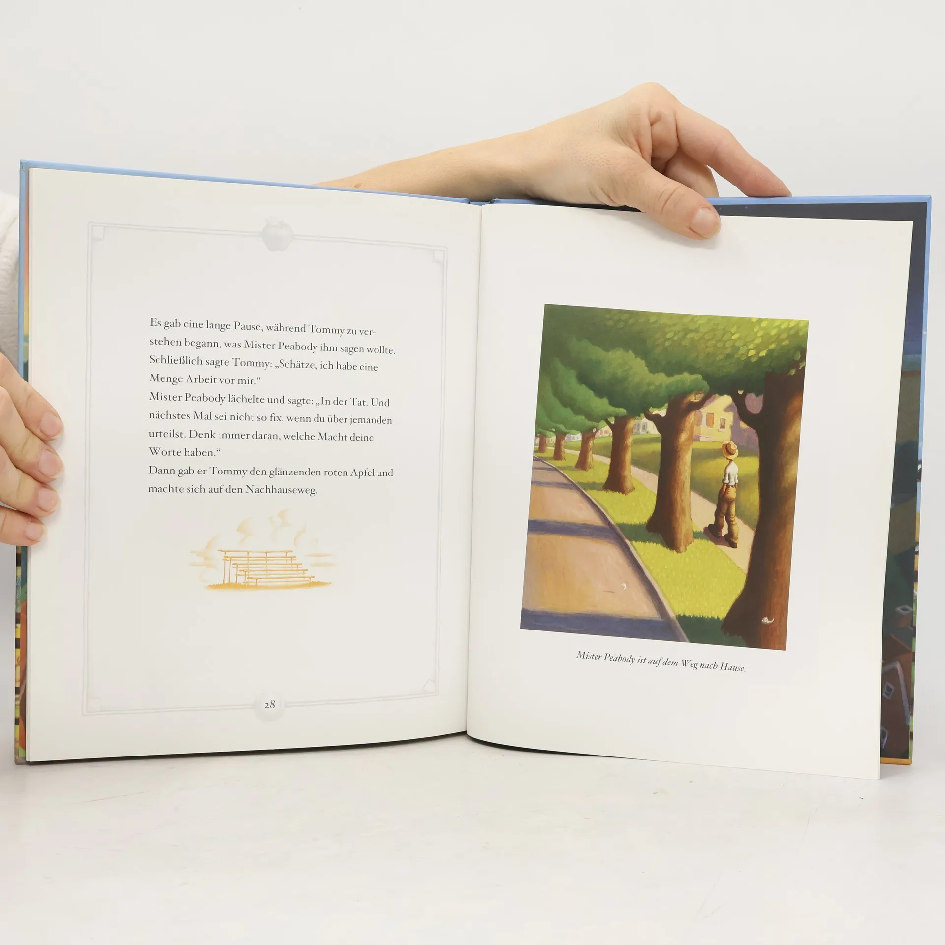 Mister Peabody ist Trainer der Schüler-Baseballmannschaft in Happville. Er ist bei allen Leuten sehr beliebt. Bis Tommy Tittlebottom behauptet, er sei ein Dieb. Zweimal hat er Mister Peabody schon beim Apfel-Stehlen beobachtet. Als sich das jedoch als Irrtum erweist, würde Tommy am liebsten alles zurücknehmen. Doch hat sich ein Gerücht erst einmal verbreitet ... Eine anrührende, kluge Kindergeschichte - erzählt von Madonna, mit außergewöhnlich stimmungsvollen Bildern von Loren Long.