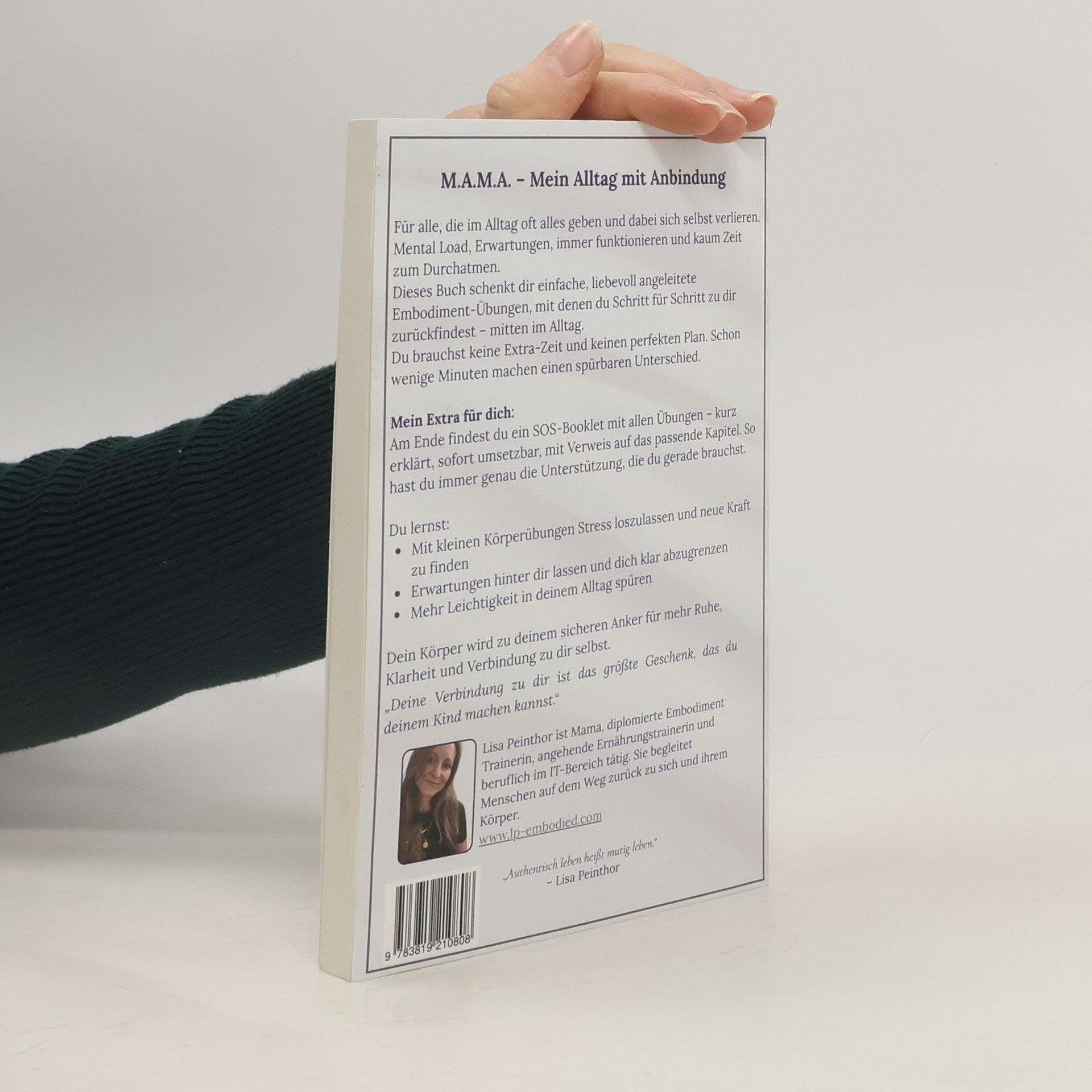 M.A.M.A. - Mein Alltag mit Anbindung ist dein sanfter Begleiter fuer mehr Ruhe und Klarheit im turbulenten Familienalltag. Dieses Buch richtet sich an alle Eltern, die im staendigen Spagat zwischen Familie, Beruf und eigenen Anspruechen leben und sich manchmal fragen, wo sie selbst in all dem bleiben. Hier findest du einfache und wohltuende Embodiment Uebungen, die dir helfen, Stress loszulassen, dich klarer abzugrenzen und neue Kraft zu tanken. Du brauchst dafuer keinen perfekten Plan und keine zusaetzliche Zeit, schon wenige Minuten koennen einen spuerbaren Unterschied machen. Besonders praktisch: Am Ende des Buches wartet ein SOS Booklet mit allen Uebungen, uebersichtlich erklaert und sofort umsetzbar, mit Verweis auf das passende Kapitel fuer mehr Hintergrundwissen. So hast du genau die Unterstuetzung, die du gerade brauchst, ob in einer ruhigen Minute oder zwischen zwei Terminen. Dieses Buch laedt dich ein, wieder in Verbindung mit dir selbst zu kommen, mehr Gelassenheit zu spueren und deinen Alltag mit neuer Leichtigkeit zu erleben.