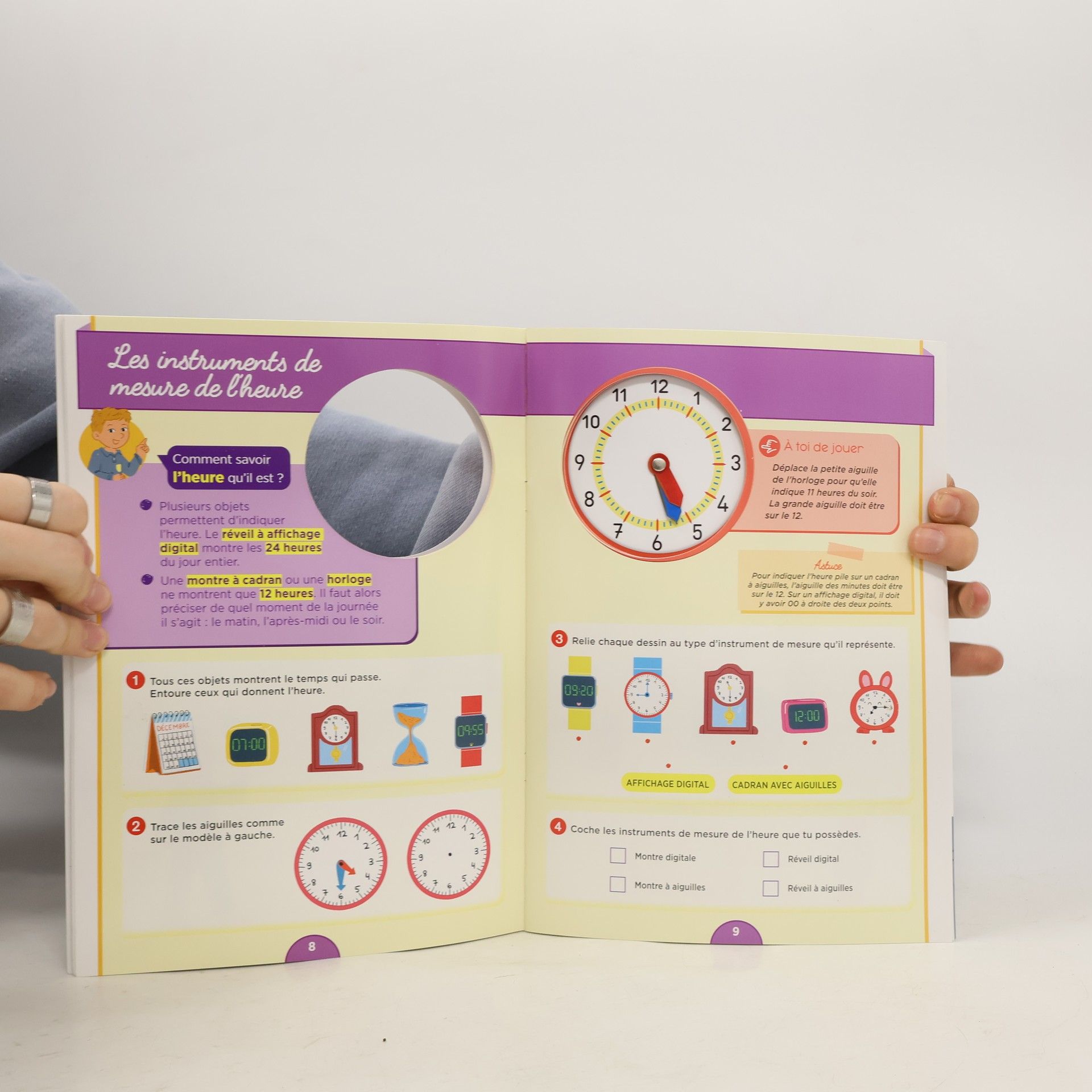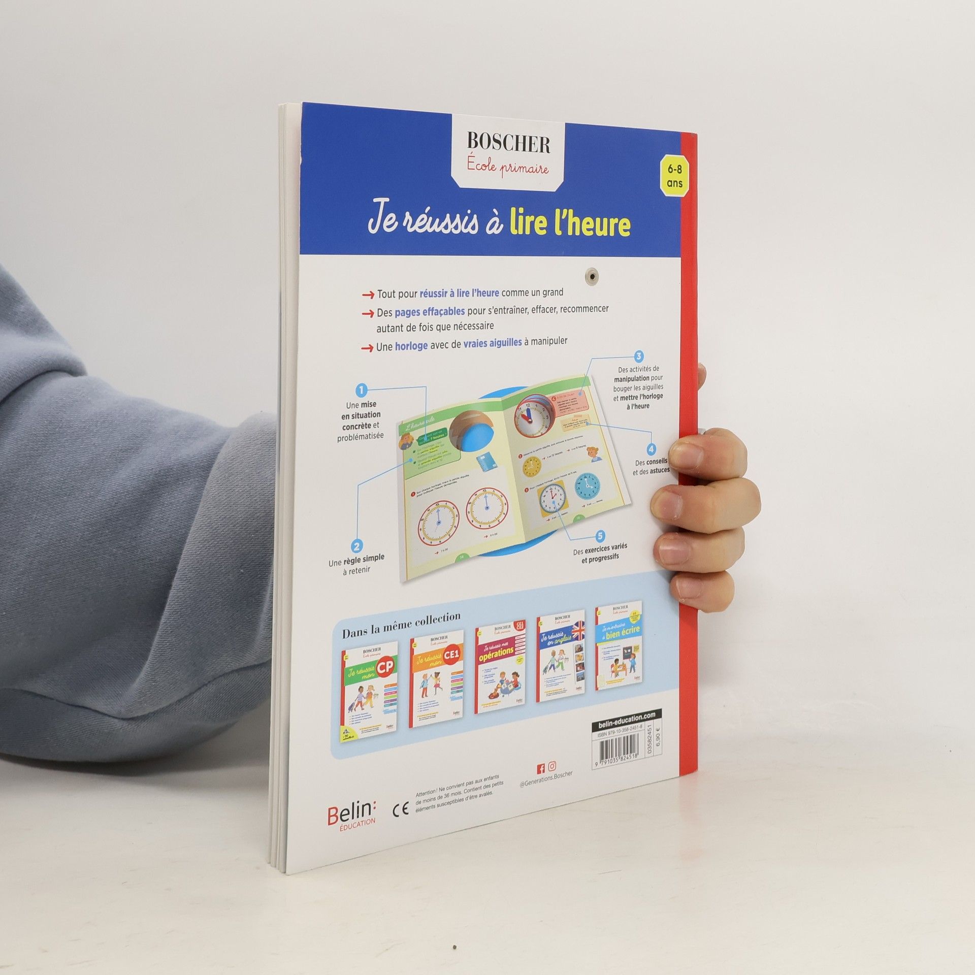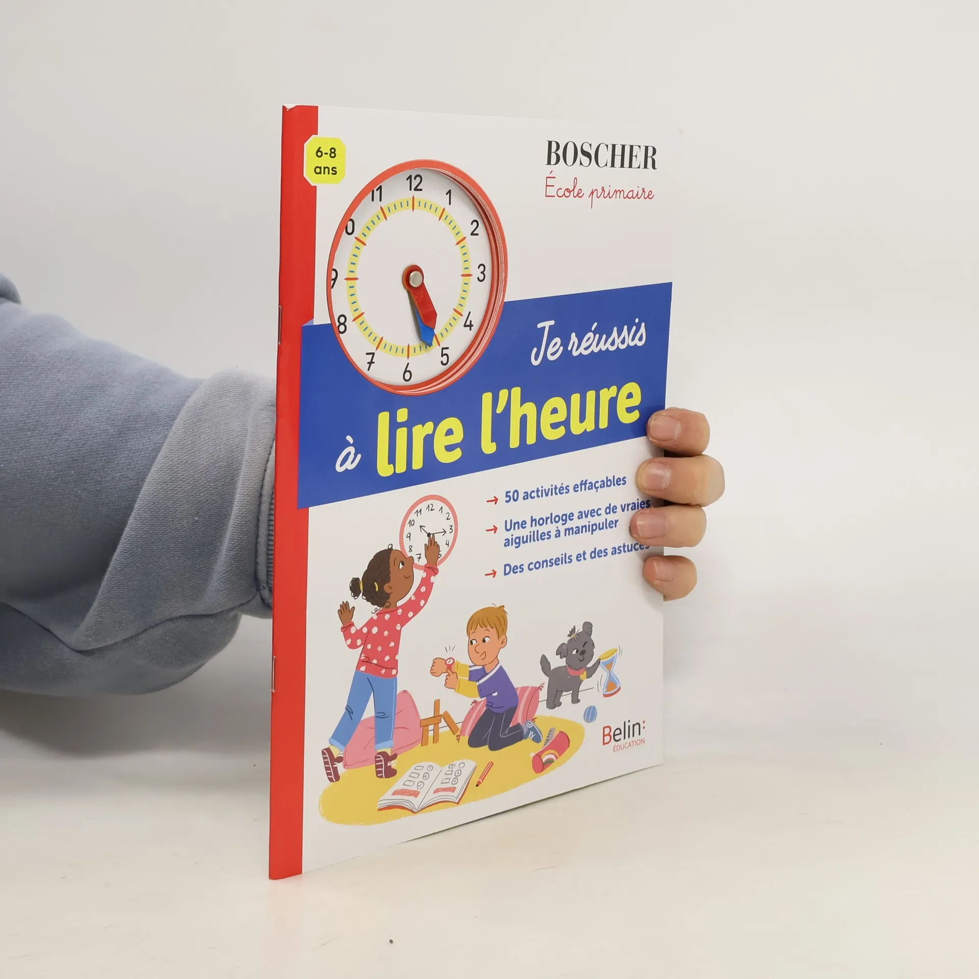 Tout pour réussir à lire l'heure ; des pages effaçables pour s'entraîner, effacer, recommencer autant de fois que nécessaire ; une horloge avec de vraies aiguilles à manipuler.