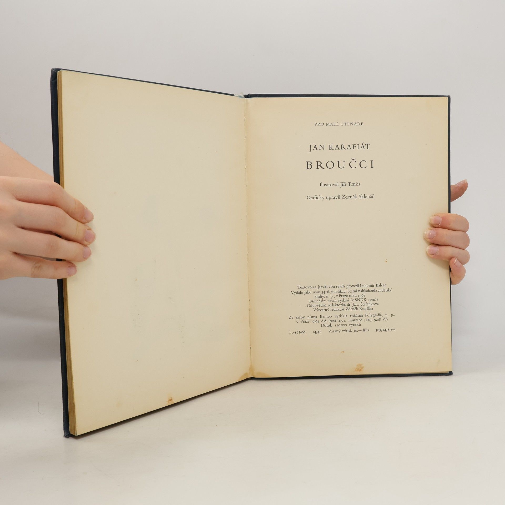 Broučky, jediné umělecké literární dílo Jana Karafiáta (1846–1929), potkaly nejednoduché osudy. Roku 1876 anonymně vyšel skromný, neilustrovaný svazek – tehdy s názvem Broučci pro malé i velké děti – a zapadl vcelku bez povšimnutí. Až teprve po sedmnácti letech knížku objevil a zpopularizoval novinář Gustav Jaroš, který ji označil jako „snad nejkrásnější květ naší české literatury dětské“ a jejího autora nazval „českým Andersenem“. Poetická obraznost Broučků, citlivý přírodní lyrismus a ušlechtilý humanismus si dále uchovávají nepomíjející platnost. I jazykově, svým jadrným básnickým slohem šťastně spojujícím hovorovost lidové řeči s vytříbenými biblismy, je dílo Jana Karafiáta pozoruhodné. Čtenářsky i posluchačsky stále přitažlivé zůstávají postavičky malých hrdinů, broučků a berušek, které při všech svých světlých stránkách nejsou zbaveny pravdivých lidských vlastností. Spolehlivým průvodcem Broučků jsou ilustrace národního umělce Jiřího Trnky, které přes časový odstup od svého vzniku na počátku čtyřicátých let nic nepozbyly ze svého půvabu.