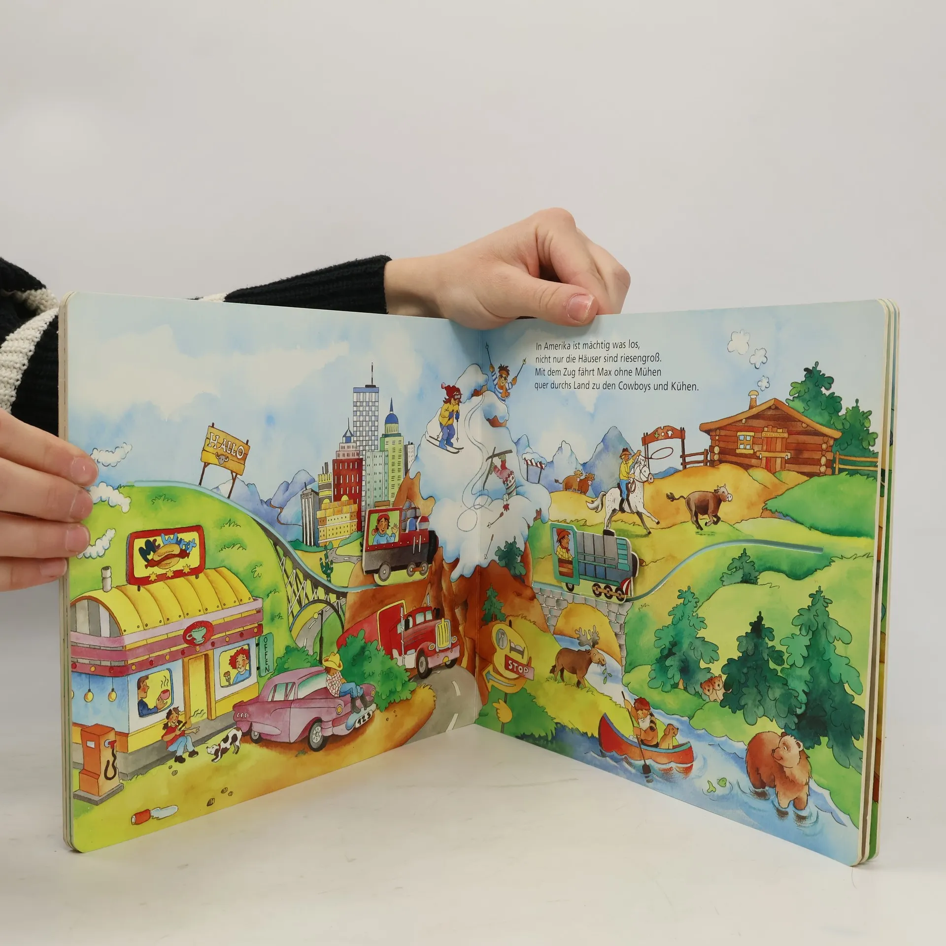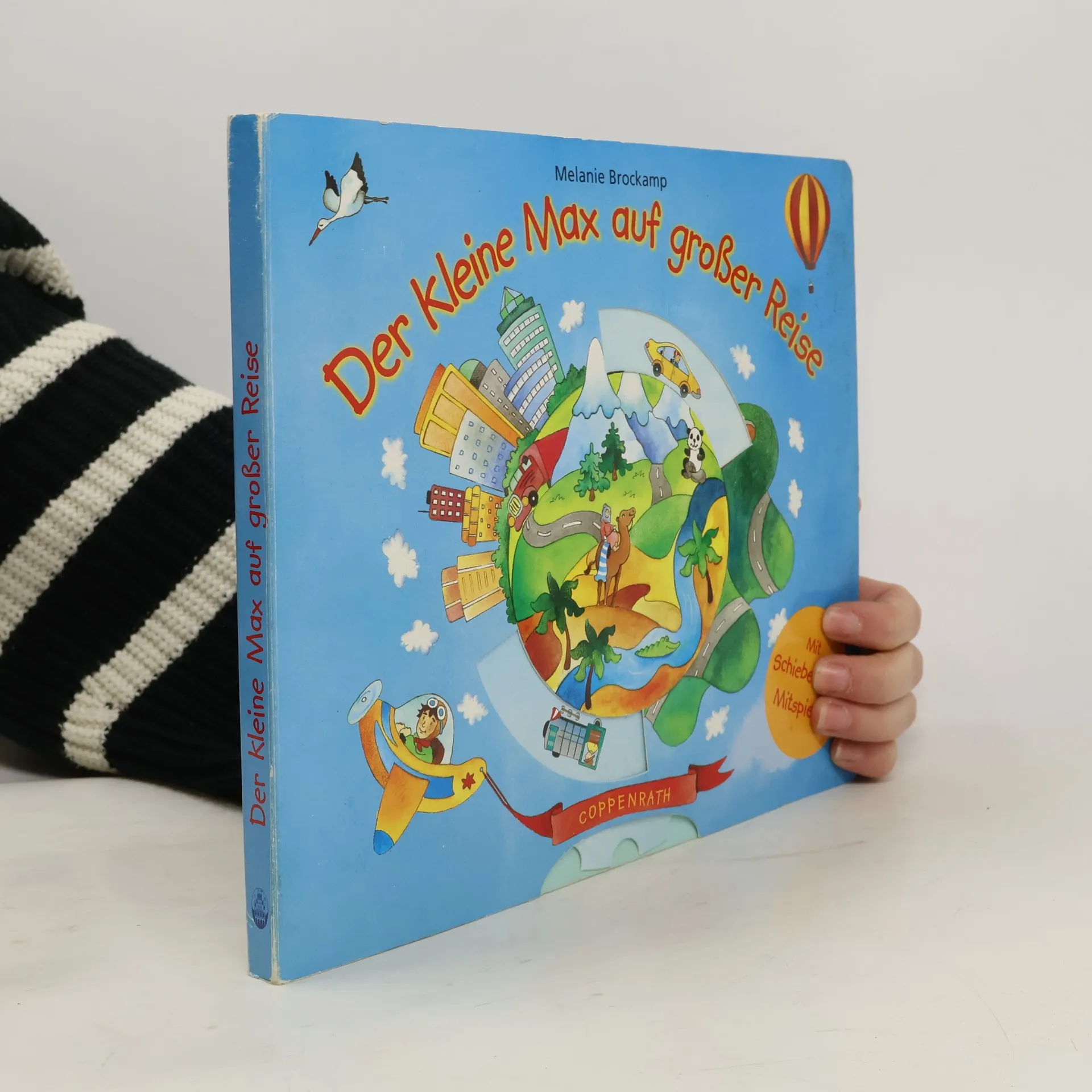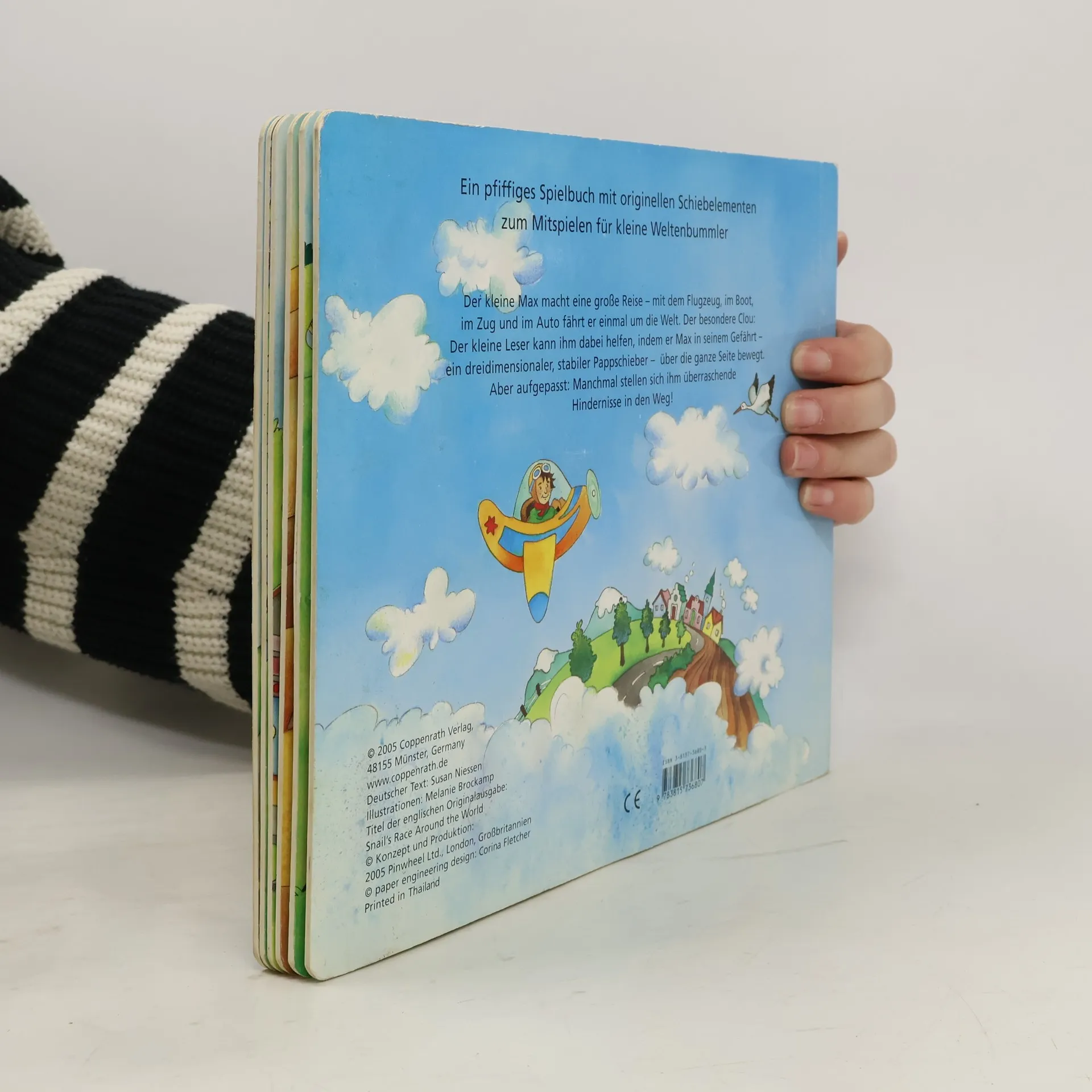 Der kleine Max macht eine Reise - mit dem Flugzeug, im Boot, im Zug und im Auto fährt er einmal um die Welt. Der besondere Clou: Der kleine Leser kann ihm dabei helfen, indem er Max mit seinem Gefährt - ein dreidimensionaler, stabiler Pappschieber - über die ganze Seite bewegt. Aber aufgepasst: Manchmal stellen sich ihm überraschende Hindernisse in den Weg! Ein pfiffiges Spielbuch zum Mitspielen!