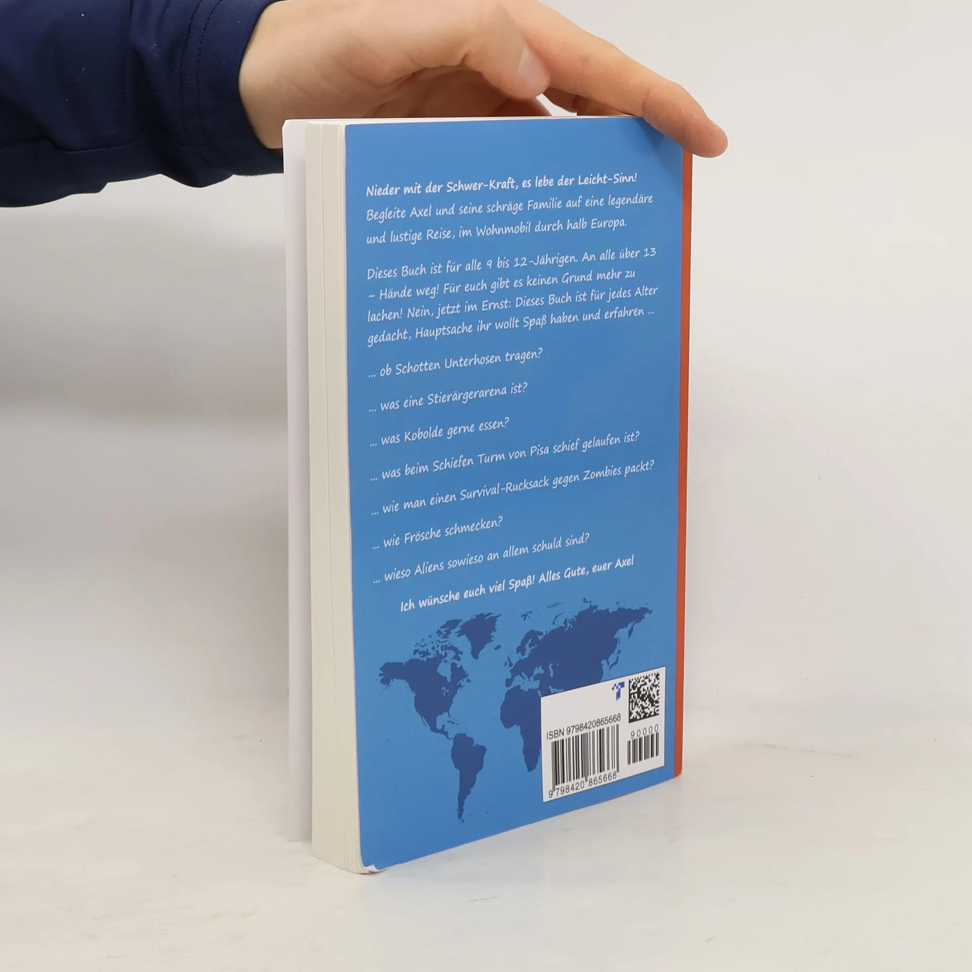 Voller lustiger Zeichnungen und Witze! Dieses Kinderbuch ist die perfekte Lektüre für alle Fans von „Gregs Tagebuch“ oder „Tom Gates“. Begleite Axel und seine schräge Familie auf eine legendäre und lustige Reise im Wohnmobil durch halb Europa. Dieses Buch ist für alle 9 bis 12 jährige. An alle über 13 – Hände weg! Für euch gibt es keinen Grund mehr zu lachen!Nein, jetzt Dieses Buch ist für jedes Alter gedacht, Hauptsache ihr wollt Spaß haben und erfahren ...... ob Schotten Unterhosen tragen?... was eine Stierärgerarena ist?... was Kobolde gerne essen?... beim Schiefen Turm von Pisa schief gelaufen ist?... was in einen Survival-Rucksack gegen Zombies rein muss!... wie Frösche schmecken.... wieso Aliens sowieso an allem schuld sind!Das perfekte Dieser lustige Kinderroman voller chaotisch-lustiger Abenteuerist das ideale Geschenk für alle Jungs und Mädchen ab 9 Jahren. Lachanfälle garantiert!So macht Lesen Spaß: Viele Cartoons, ein sympathischer Held und eine wunderbar warmherzige und witzige Geschichte mit vielen Überraschungen. Überzeugt auch Lesemuffel!Empfohlen von Axels Reisetagebuch zählt zu den Top 10 empfohlenen Büchern bei kita.de, der unabhängigen Plattform mit über 1 Million Lesern pro Jahr! Der Titel ist mit einem Quiz auch bei Antolin gelistet!Nieder mit der Schwer-Kraft, es lebe der Leicht-Sinn! Anschnallen und festhalten für das coolste und lustigste Abenteuer aller Zeiten!