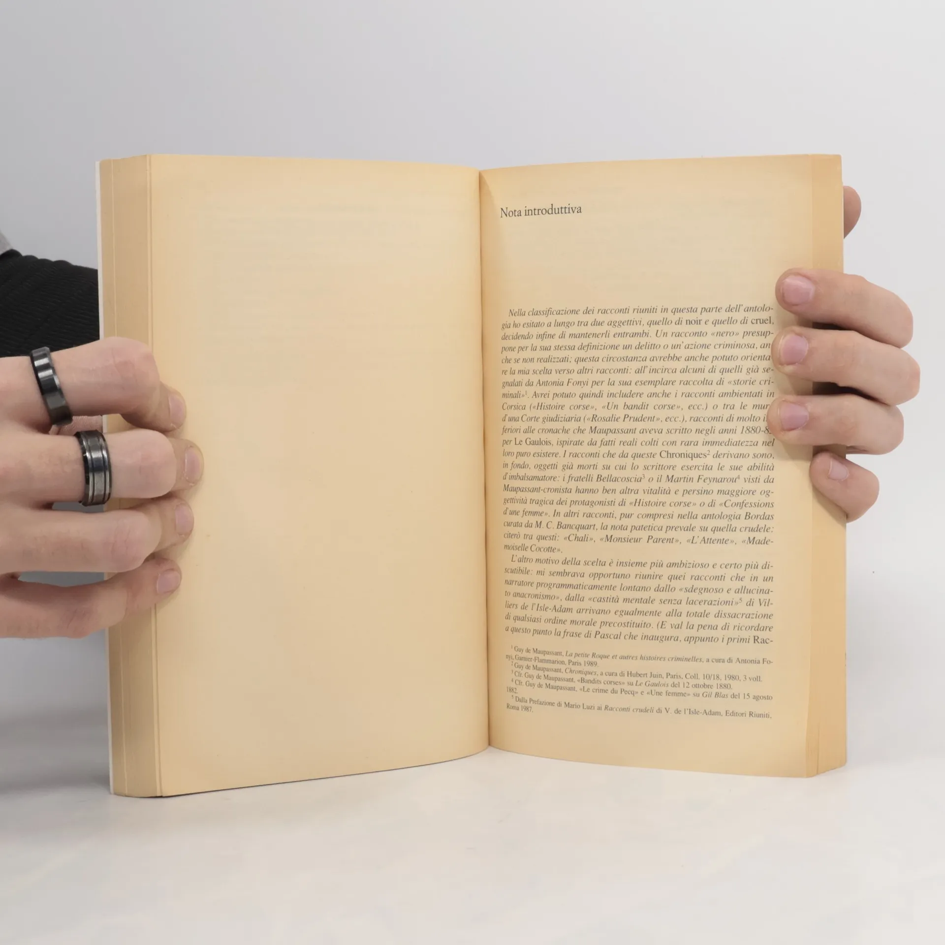 Un’atmosfera inquietante, fosca, ossessiva, una costante e pericolosa oscillazione tra la lucida razionalità e la più inafferrabile visionarietà, l’allontanamento completo da tutti i «sani» princìpi della dignità borghese a favore della più esplicita, dilacerante follia fanno di questi racconti il grafico capriccioso, tormentato, sconvolgente dell’esistenza umana, nella quale la penna implacabile di Maupassant affonda senza più riserve. La grandezza di questi racconti è nell’intuizione che gli uomini vivono almeno due vite, quella reale e quella della memoria-immaginazione: è nella partecipazione, ora fervida, ora dolorosa, a entrambe queste vite.