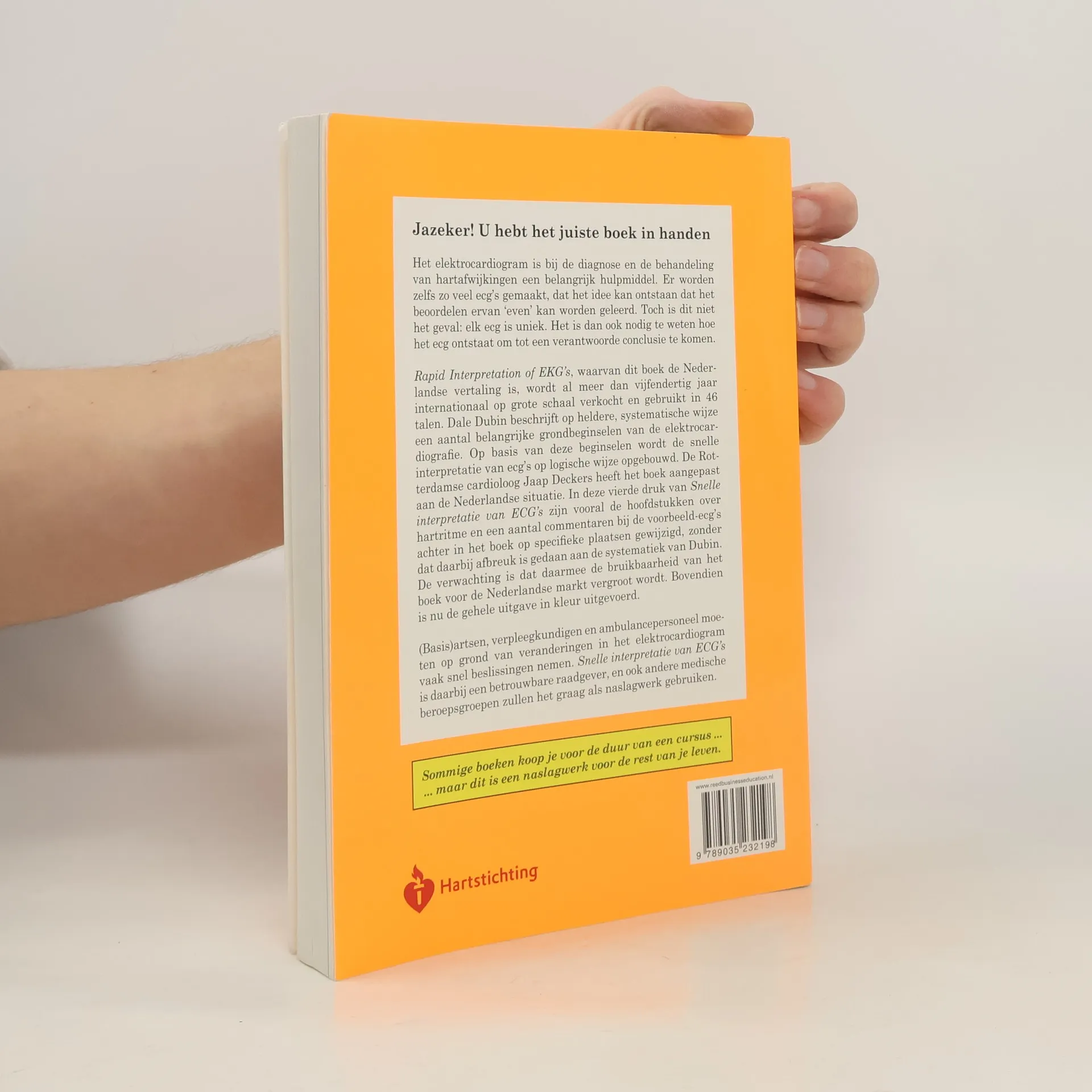 U hebt het juiste boek in handen! Het elektrocardiogram is cruciaal voor de diagnose en behandeling van hartafwijkingen. Hoewel er veel ecg's worden gemaakt, is het beoordelen ervan niet eenvoudig; elk ecg is uniek. Het is essentieel te begrijpen hoe een ecg ontstaat om tot een juiste conclusie te komen. Deze Nederlandse vertaling van een internationaal veelgebruikt boek, dat al meer dan vijfendertig jaar in 46 talen verkrijgbaar is, biedt een heldere en systematische uitleg van belangrijke grondbeginselen van de elektrocardiografie. Dale Dubin legt de basis voor een snelle interpretatie van ecg's. De Rotterdamse cardioloog Jaap Deckers heeft het boek aangepast aan de Nederlandse situatie, met wijzigingen in de hoofdstukken over hartritme en commentaren bij voorbeeld-ecg's, zonder de systematiek van Dubin aan te tasten. Deze vierde druk is volledig in kleur uitgevoerd, wat de bruikbaarheid voor de Nederlandse markt vergroot. (Basis)artsen, verpleegkundigen en ambulancepersoneel moeten vaak snel beslissingen nemen op basis van veranderingen in het elektrocardiogram. Dit boek is een betrouwbare raadgever en een waardevol naslagwerk voor andere medische beroepsgroepen. Sommige boeken zijn tijdelijk, maar dit is een naslagwerk voor de rest van je leven.