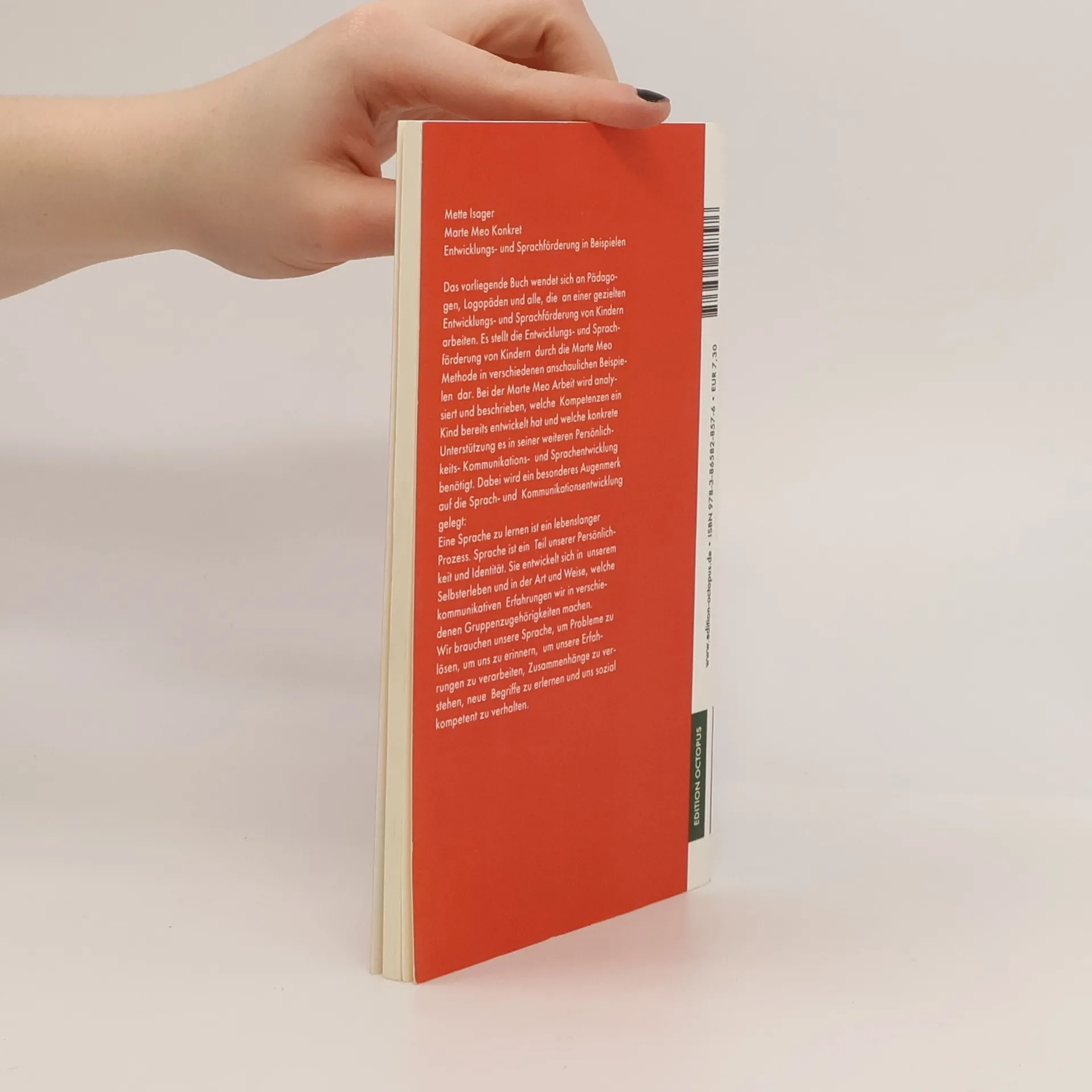 Das vorliegende Buch wendet sich an Pädagogen, Logopäden und alle, die an einer gezielten Entwicklungs- und Sprachförderung von Kindern arbeiten. Es stellt die Entwicklungs- und Sprachförderung von Kindern durch die Marte Meo Methode in verschiedenen anschaulichen Beispielen dar. Bei der Marte Meo Arbeit wird analysiert und beschrieben, welche Kompetenzen ein Kind bereits entwickelt hat und welche konkrete Unterstützung es in seiner weiteren Persönlichkeits- Kommunikations- und Sprachentwicklung benötigt. Dabei wird ein besonderes Augenmerk auf die Sprachund Kommunikationsentwicklung gelegt: Eine Sprache zu lernen ist ein lebenslanger Prozess. Sprache ist ein Teil unserer Persönlichkeit und Identität. Sie entwickelt sich in unserem Selbsterleben und in der Art und Weise, welche kommunikativen Erfahrungen wir in verschiedenen Gruppenzugehörigkeiten machen. Wir brauchen unsere Sprache, um Probleme zu lösen, um uns zu erinnern, um unsere Erfahrungen zu verarbeiten, Zusammenhänge zu verstehen, neue Begriffe zu erlernen und uns sozial kompetent zu verhalten.