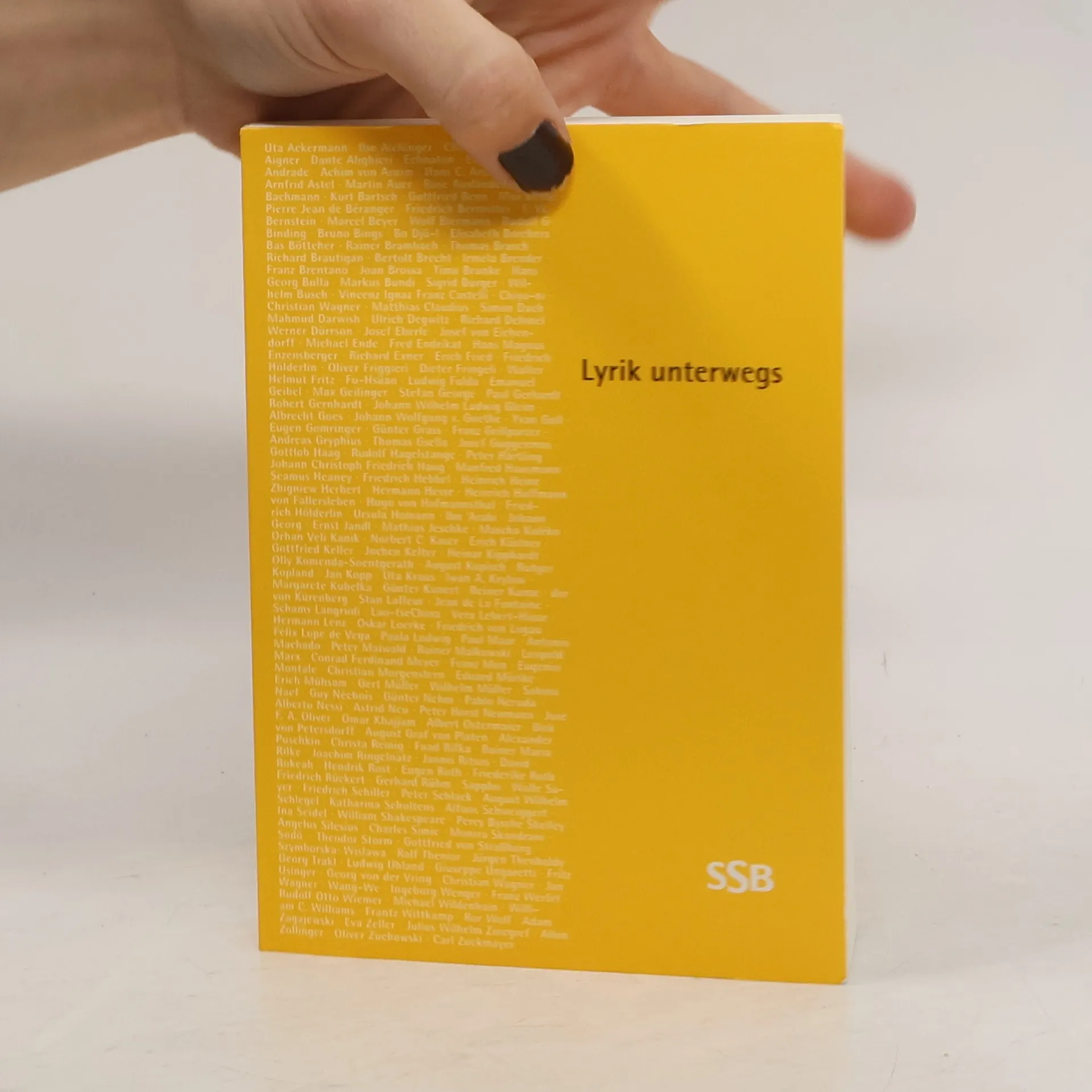 Lyrik unterwegs, Uta Ackermann-Fritsch, Josef G. Aigner, Ilse Aichinger, Dante Alighieri, Erdmuth E. Andrade, Ludwig Achim von Arnim, Hans C. A. Arnfrid Astel, Martin Auer, Rose Ausländer, BACHMANN, Kurt Bartsch, Gottfried Benn, Max Bense, Pierre Jean de Béranger, T. V. Bernstein, Marcel Beyer, Wolf Biermann, Heinz G. Binding, Bruno Bings, Bo Bo-1, Elisabeth Borchers, Bas Böttcher, Rainer Brambach, Thomas Branch, Richard Brautigan, Bertolt Brecht, Irmela Brender, Franz Brentano, Joan Brossa, Timo Brunke, Hans Georg Bulla, Markus Bundi, Sigrid Burger, Wilhelm Busch, Vincenz Ignaz Franz Castelli, Christian Wagner, Matthias Claudius, Simon Dach, Mahmud Darwish, Ulrich Deguitz, Richard Dehmel, Werner Dürrson, Josef Eberle, Joseph von Eichendorff, Michael Ende, Fred Endrikat, Hans Magnus Enzensberger, Richard Exner, Erich Fried, Friedrich Hölderlin, Oliver Friggieri, Dieter Fringeli, Walter Helmut Fritz, Fu-Hsüan, Ludwig Fels, Emanuel Geibel, Max Geilinger, Stefan George, Paul Gerhardt, Robert Gernhardt, Johann Wilhelm Ludwig Gleim, Albrecht Goes, Johann Wolfgang von Goethe, Theo Goll, Eugen Gomringer, Günter Grass, Franz Grillparzer, Andreas Gryphius, Thomas Gsella, Josef Cuggenmos, Gottlieb Haag, Rudolf Hagelstange, Peter Härtling, Johann Christoph Friedrich Haug, Manfred Hausmann, Seamus Heaney, Friedrich Hebbel, Heinrich Heine, Zbigniew Herbert, Hermann Hesse, Heinrich Hoffmann Von Fallersleben, Hugo von Hofmannsthal, Ursel Hosch, Ibn Arabi, Johann Georg Ernst Jandl, Matthias Jeschke, Mascha Kaléko, Orhan Veli Kanık, Norbert C. Kaser, Erich Kästner, Gottfried Keller, Jochen Kelter, Rutger Kopland, Jan Kopp, J. A. Kreyßig, Uta Kress, Margarete Kubelka, Günter Kunert, Reiner Kunze, Jür. von Kurenberg, Stan Lafleur, Jean de La Fontaine, Schams Langrudi, Lao-tse China, Vera Lebert-Müller, Hermann Lenz, Oskar Loerke, Friedrich von Logau, Félix Lope de Vega, Paula Ludwig, Paul Maar, Antonio Machado, Peter Maiwald, Rainer Malkowski, Leopold Marx, Conrad Ferdinand Meyer, Franz Misa, Eugen Monfale, Christian Morgenstern, Eduard Mörike, Erich Mühsam, Gert Müller, Wilhelm Müller, Salomo Naef, Ursula Naumann, Guy Nechama, Günter Nehm, Pablo Neruda, Alberto Neiss, Astrid Nica, Peter Horst Neumann, Josef F. A. Oliver, Omar Khajam, Albert Ostermaier, Dirk von Petersdorff, August Platen, Aleksandr Sergejevič Puškin, Christa Reinig, Fred Rilka, Rainer Maria Rilke, Joachim Ringelnatz, Jannis Ritsos, David Rokeah, Hendrik Rost, Eugen Roth, Friederike Roth, Friedrich Rückert, Gerhard Rühm, Sapfo, Peter Schick, Friedrich Schiller, August Wilhelm Schlegel, Katharina Schultens, Alfons Schweiggert, Altoun Schweneggert, Kurt Schwitters, Percy Bysshe Shelley, Ina Seidel, William Shakespeare, Angelus, Charles Simic, Maura Skandara, Sodó, Walle Söyer, Stuttgarter Straßenbahnen Aktiengesellschaft, Theodor Storm, Gottfried, Srymborska Wisława, Ralf Thenior, Jürgen Theobaldy, Georg Trakl, Ludwig Uhland, Giuseppe Ungaretti, Fritz Usinger, Georg von der Vring, Wagner Jan, Wang-We, Ingeborg Vettermann, Franz Werfel, Rudolf Otto Wiemer, Michael Wildenhain, William C. Williams, Franz Wittkamp, Rolf Wolf, Adam Zangajewski, Eva Zeller, Julius Wilhelm Zmegac, Adam Zollinger, Oliver Zuchowski, Carl Zuckmayer
