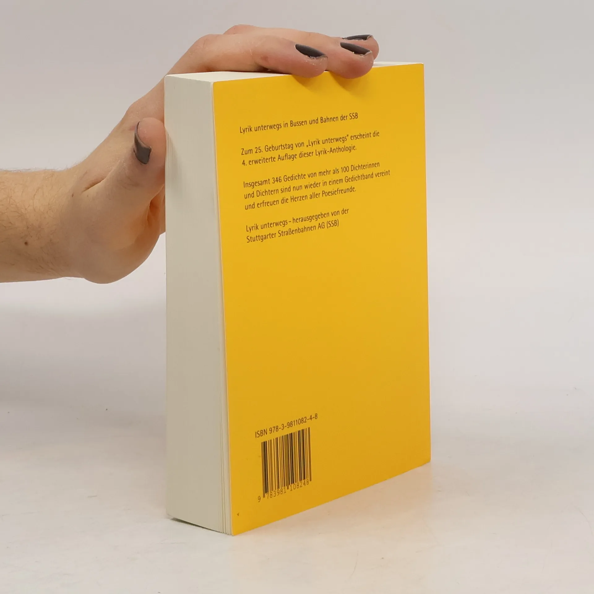 Lyrik unterwegs in Bussen und Bahnen der SSB Zum 25. Geburtstag von „Lyrik unterwegs“ erscheint die 4. erweiterte Auflage dieser Lyrik-Anthologie. Insgesamt 346 Gedichte von mehr als 100 Dichterinnen und Dichtern sind nun wieder in einem Gedichtband vereint und erfreuen die Herzen aller Poesiefreunde. Lyrik unterwegs - herausgegeben von der Stuttgarter Straßenbahnen AG (SSB)