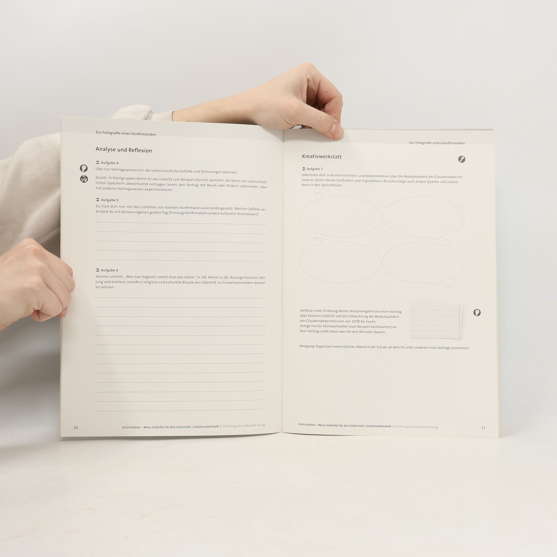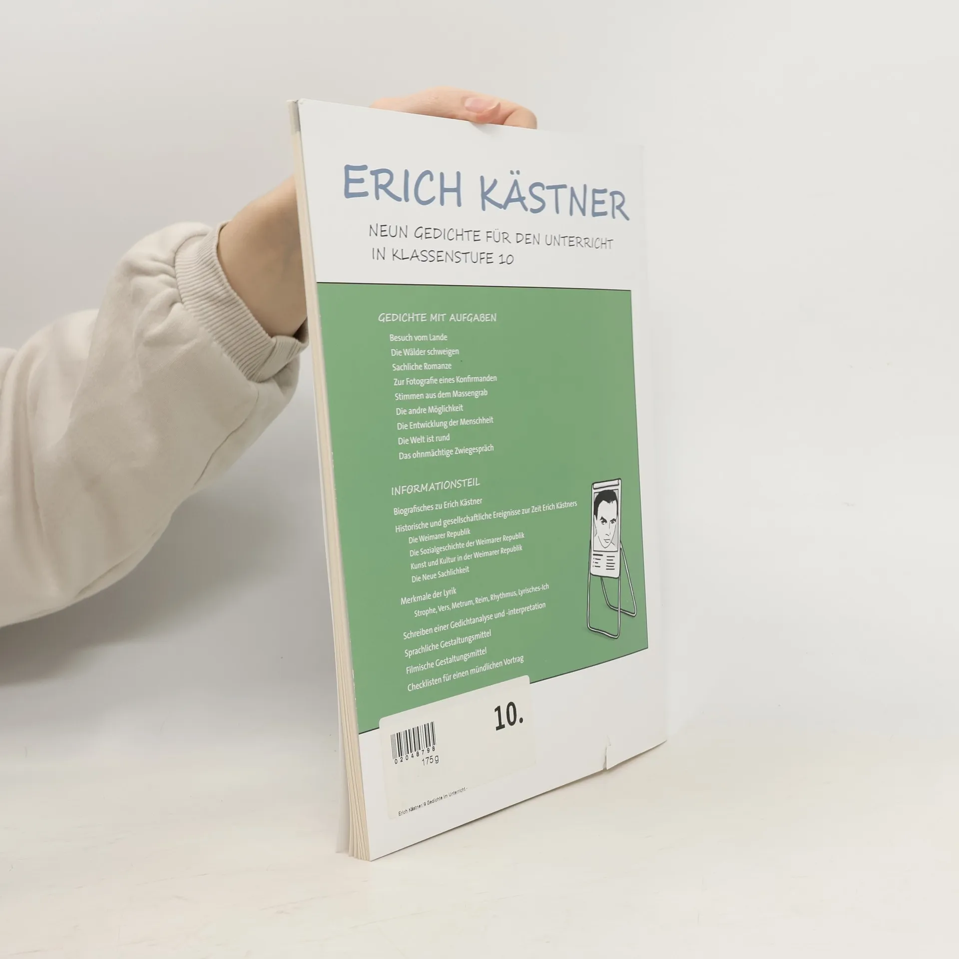 Kästners andere Seite Wenn man den Namen Erich Kästner hört, denkt man häufig zuerst an seine beliebten Kinderbücher, die über Generationen hinweg gelesen wurden. Der Dresdner Schriftsteller ist zudem einer der wichtigsten Lyriker seiner Zeit und hat neben humoristischen auch neu sachliche und zeitkritische Gedichte verfasst. Das Heft enthält ausgewählte, methodisch-didaktisch aufgearbeitete Gedichte Erich Kästners zur Behandlung in der Klassenstufe 10. Das Schülerheft enthält neben den sechs Gedichten, die durch das Ministerium für Bildung und Kultur verpflichtend vorgegeben sind drei zusätzliche Gedichte, die inhaltlich und thematisch auf die Pflichtgedichte abgestimmt sind. Ausgewählte Gedichte Erich Kästners Stimmen aus dem Massengrab (1928) Sachliche Romanze (1928) Besuch vom Lande (1929) Die andere Möglichkeit (1930) Die Entwicklung der Menschheit (1932) Zur Fotografie eines Konfirmanden (1933) Zusätzliche Gedichte Die Welt ist rund (1928)