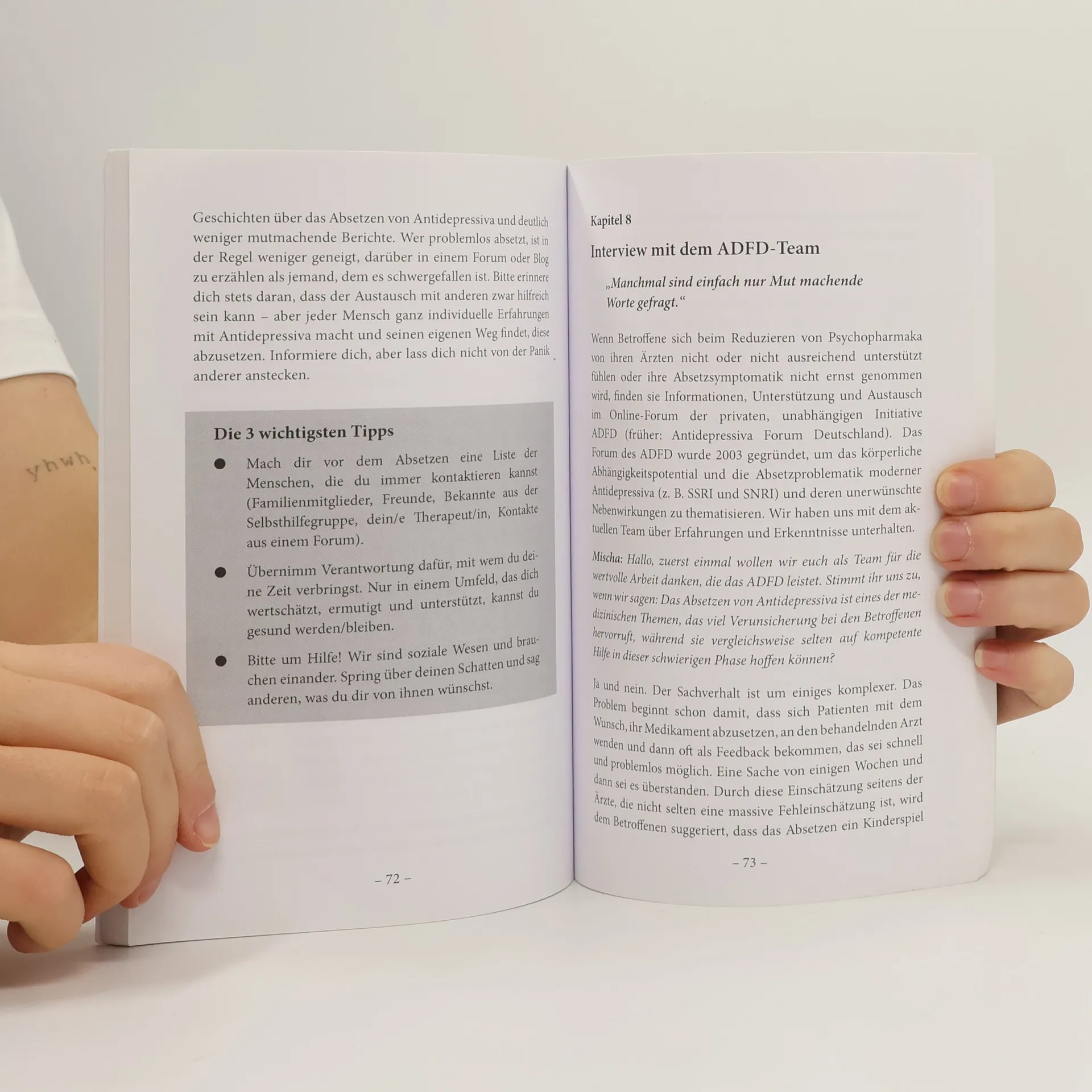Melanie M�ller und Mischa Miltenberger haben sich an ein brisantes Thema gewagt. Sie erz�hlen ihre Geschichte, wie sie selbst nach jahrelanger Einnahme den Schritt in ein Leben ohne Antidepressiva geschafft haben. In Interviews tragen sie Expertenwissen zusammen und beginnen einen Dialog, den es hierzulande in dieser Form noch nicht gibt. Dazu zeigen die beiden Autoren hilfreiche Wege und Methoden, mit denen sie es geschafft haben, sich wieder zu stabilisieren und ein gesundes, unabh�ngiges Leben zu f�hren. Einf�hlend und mit Fachwissen setzen sie sich f�r einen offenen Umgang mit dem Thema ein und ermutigen dazu, den eigenen Weg beim Absetzen von Antidepressiva zu nehmen. Mit ungeschminkten Einblicken in die eigenen Geschichten wollen sie Mut machen. Ein Buch f�r Betroffene und deren Angeh�rige. Offen, ehrlich und mutig.