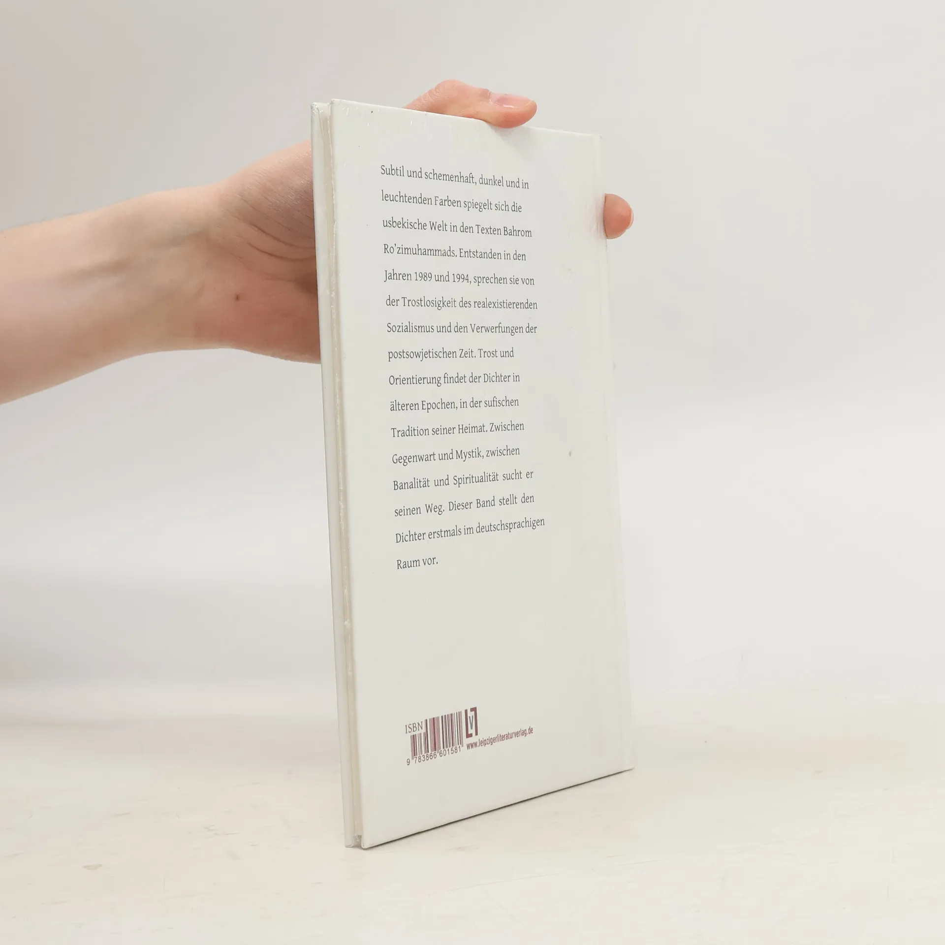 Subtil und schemenhaft, dunkel und in leuchtenden Farben spiegelt sich die usbekische Welt in den Texten Bahrom Ro’zimuhammads. Entstanden in den Jahren 1989 und 1994, sprechen sie von der Trostlosigkeit des realexistierenden Sozialismus und den Verwerfungen der postsowjetischen Zeit. Trost und Orientierung findet der Dichter in älteren Epochen, in der sufischen Tradition seiner Heimat. Zwischen Gegenwart und Mystik, zwischen Banalität und Spiritualität sucht er seinen Weg. Dieser Band stellt den Dichter erstmals im deutschsprachigen Raum vor.