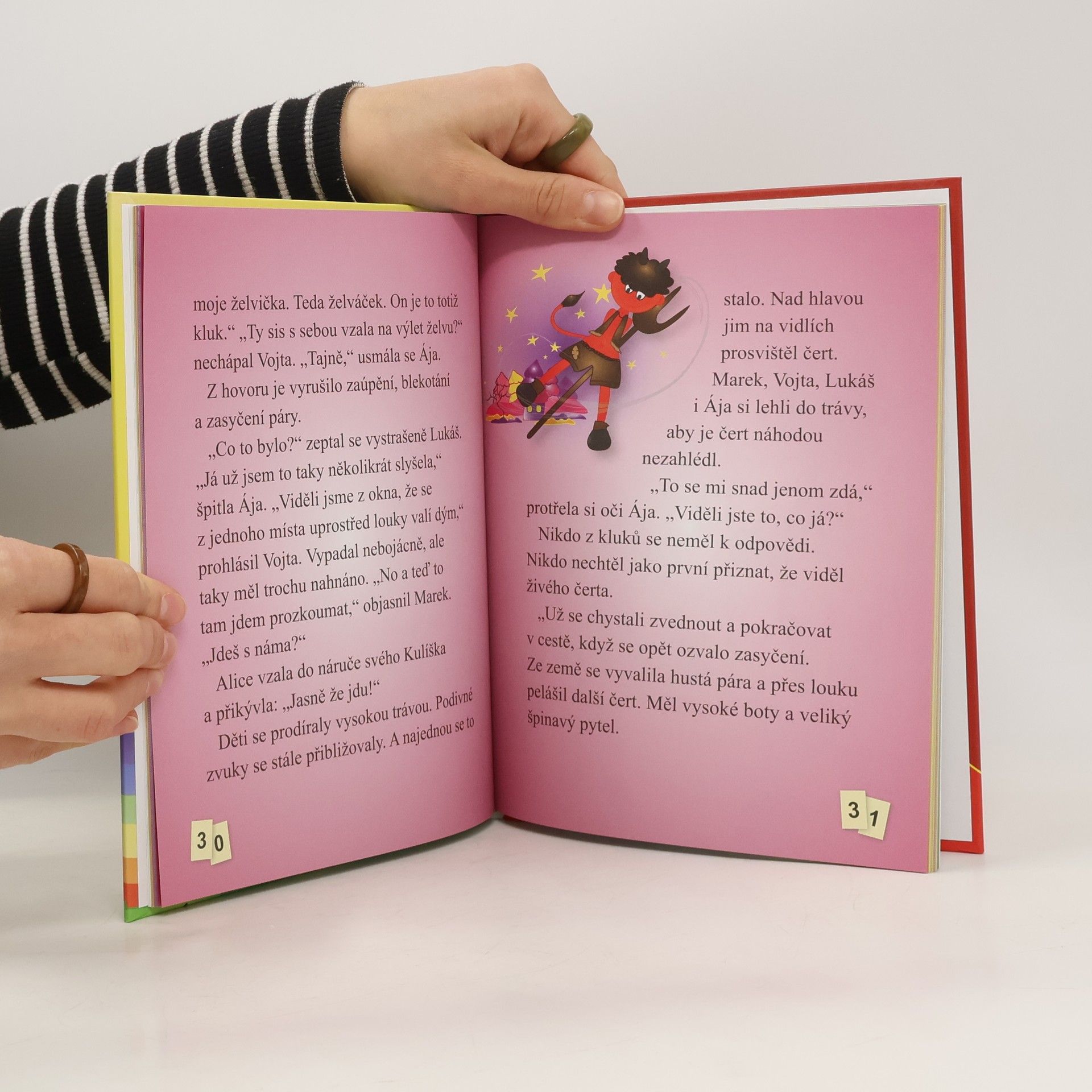 Všechny děti touží zažít něco tajemného a dobrodružného. Paní učitelka jedné neposedné třídy je stejného názoru, a proto pro děti uspořádá výlet do obce Peklo. Děti se ocitnou v podivuhodném penzionu, kde na ně ze všech koutů koukají čerti ze dřeva nebo z keramiky. Pan hostinský vaří jídla s pekelnými názvy a děti straší vymyšlenými čertovskými historkami Jednou po setmění se zvenku začne ozývat podivný hluk... Tři nebojácní chlapci a jedna dívka se vydají za tajemnými zvuky a najdou vchod do skutečného pekla. Ve všech pohádkách platí, že co peklo jednou schvátí, to už nenavrátí. Děti ale mají štěstí, že se seznámí s malým čertíkem, a díky němu se opět dostanou zpátky. Knihu doprovázejí netradiční počítačové ilustrace Jany Valentovičové.