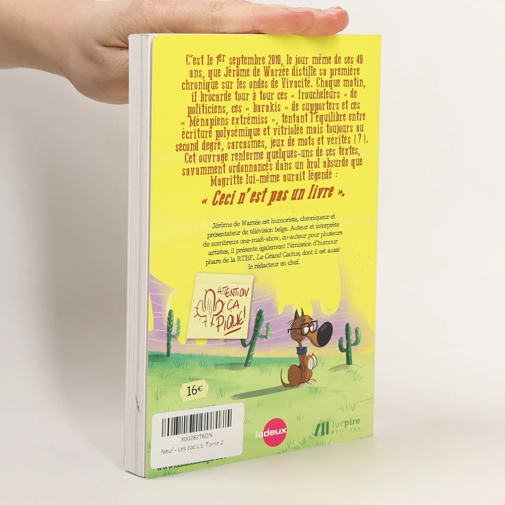 C'est le 1er septembre 2010, le jour même de ses 40 ans, que Jérôme de Warzée distille sa première chronique sur les ondes de Vivacité. Chaque matin, il brocarde tour à tour ces "froucheleurs" de politiciens, ces "barakis" de supporters et ces "Ménapiens extrémiss", tentant l'équilibre entre écriture polysémique et vitriolée mais toujours au second degré, sarcasmes, jeux de mots et vérités (?). Cet ouvrage renferme quelques-uns de ses textes, savamment ordonnancés dans un brol absurde que Magritte lui-même aurait légendé: "Ceci n'est pas un livre".