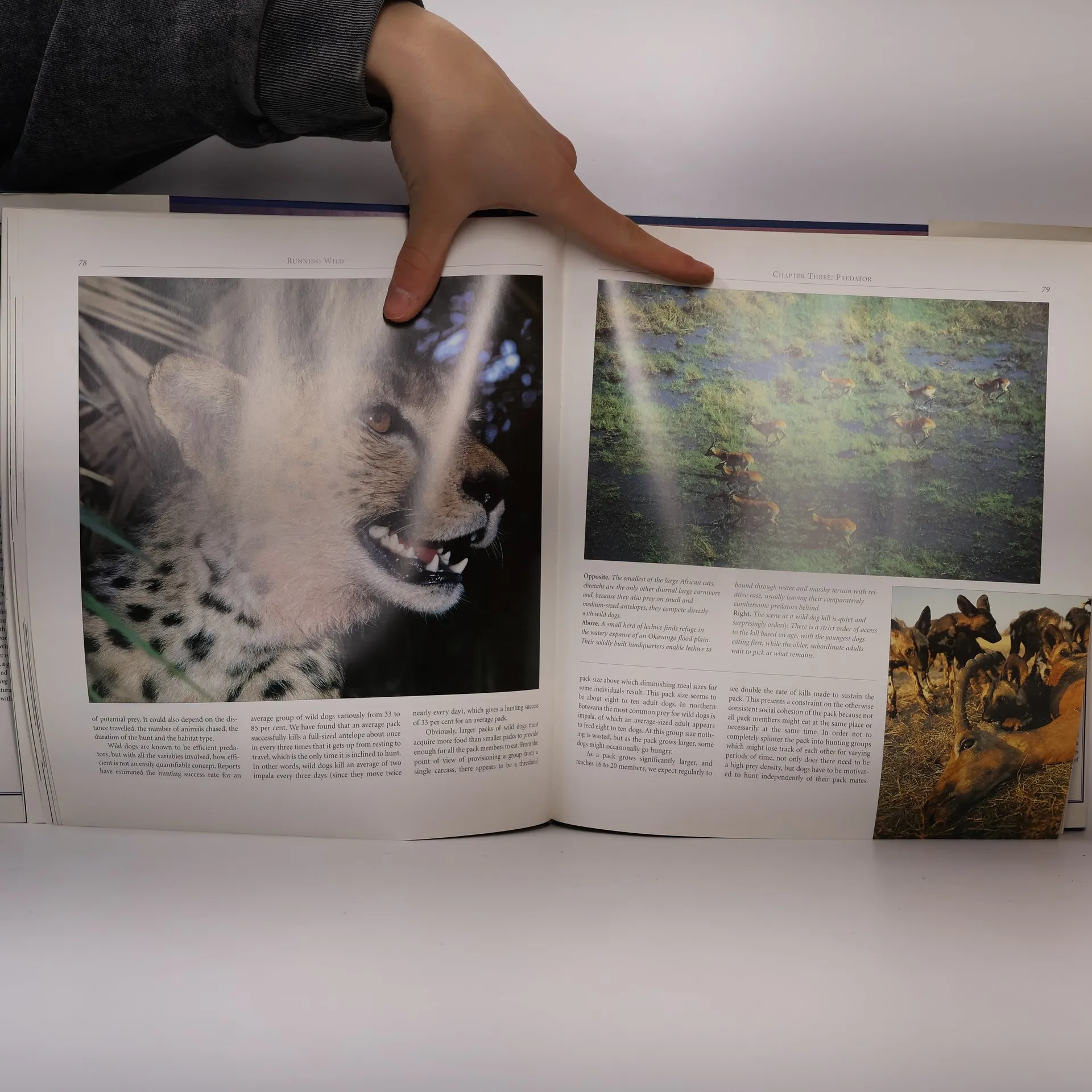 Photography by, Signed & inscribed on the half-title page, "To Leone - Wild Dog Camps August 1999 - Sorry you weren't here - Consolation prize is one copy of Running Wild - Best regards - Helene Heldring - dave Hamman." Text by John McNutt and lesley Boggs - 10.5x12" 151 pages profusely & vibrantly illustrated color photography. Copyright 1996, Originally published by Southern Book Publishers, This Edition published by Wilderness Safaris, stated First Edition, first impression 1997.