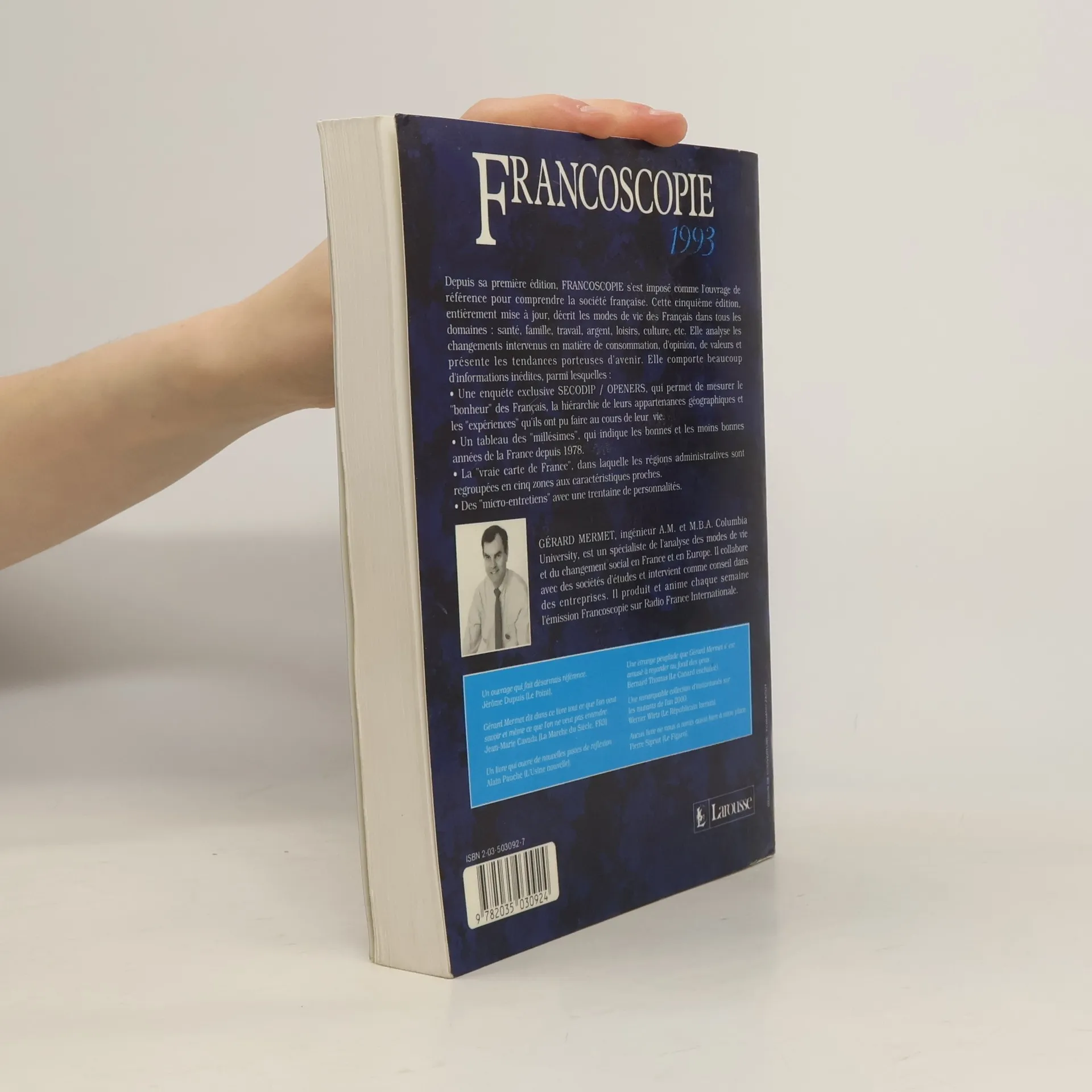 L ouvrage, enrichi a chaque edition, propose une description vivante, chiffree et argumentee des modes de vie, des modes de consommation et des valeurs des Francais. Organisation de l ouvrage - 10 000 chiffres; 200 tableaux; 130 graphiques - 6 grandes sections: * l individu, * la famille, * la societe, * le travail, * les loisirs, * l argent - Une synthese comprenant: un portrait-robot du Francais, un observatoire des valeurs qui sont aujourd hui celles des Francais - Une comparaison (depuis 1978) du niveau de satisfaction des Francais annee par annee (- Les Millesimes -) - Une grande synthese des tendances nouvelles concernant les attitudes et les comportements des Francais."