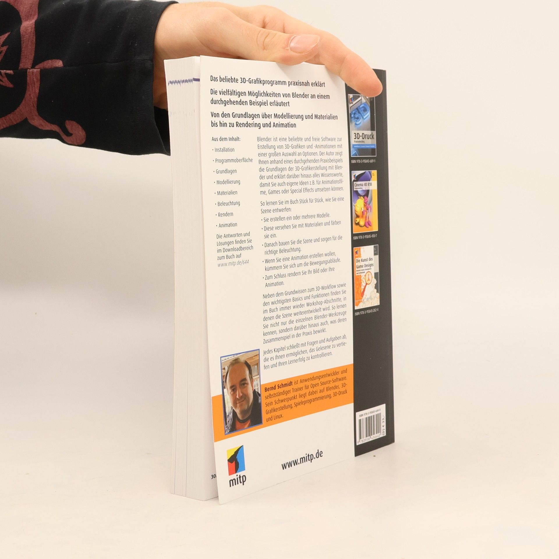 Das beliebte 3D-Grafik-Programm praxisnah erklart Schritt fur Schritt zur lebensnahen Grafik Die vielfaltigen Moglichkeiten von Blender an einem durchgehenden Beispiel erlautert Das OpenSource-Programm Blender bietet alle Tools, die man von einem professionellen 3D-Programm erwartet und ist somit auch fur den beruflichen Einsatz geeignet. LEider ist es nicht ganz leicht, sich ohne Anleitung in dem umfangreichen Programm zurechtzufinden. BErnd Schmidt nimmt Sie an die Hand und fuhrt Sie von der Idee und der Anlage der Projektordner durch ein komplettes Projekt mit allem Drum und Dran. DAbei werden die wichtigsten Funktionen von Blender erklart und angewandt. SO sind Sie danach bestens gerustet, um auch eigene Projekte erfolgreich umzusetzen.