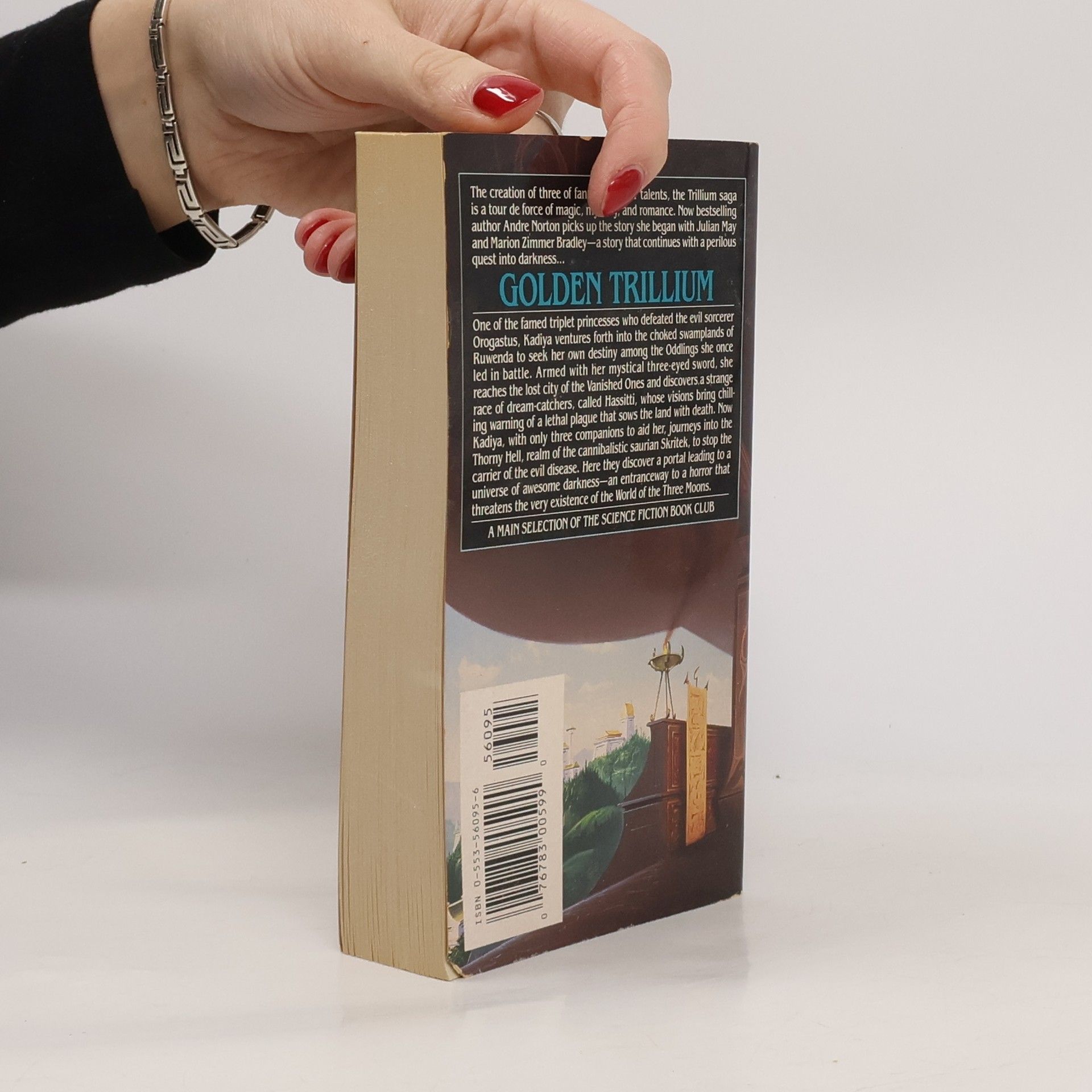 The creation of three of fantasy's stellar talents, the Trillium Saga is a tour de force of magic, mystery, and romance. Now best-selling author Andre Norton picks up the story she began with Julian May and Marion Zimmer Bradley--a story that continues with a perilous quest into darkness. . .Once the famed triplet princess who defeated the evil sorcerer Orogastus, Kadiya ventures forth into the choked swamp lands of Ruewena to seek her own destiny among the Oddlings she once led in battle. Armed with her mystical three-eyed sword, she reaches the lost city of the Vanished Ones and discovers a strange race of dream-catchers, called Hassitti, whose visions bring chilling warning of a lethal plague that sows the land with death. Now Kadiya, with only three comparisons to aid her, journeys into the Thorny Hell, realm of the cannibalistic saurian Skritek, to stop the carrier of the evil disease. Here they discover a portal leading to a universe of awesome darkness--an entranceway to a horror that threatens the very existence of The World Of The Three Moons .