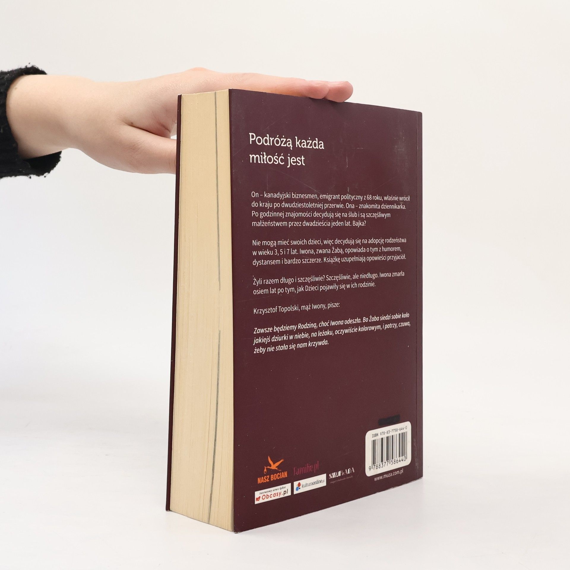 On – kanadyjski biznesmen, emigrant polityczny z 68 roku, właśnie wrócił do kraju po dwudziestoletniej przerwie. Ona – znakomita dziennikarka. Po godzinnej znajomości decydują się na ślub i są szczęśliwym małżeństwem przez dwadzieścia jeden lat. Bajka? Nie mogą mieć swoich dzieci, więc decydują się na adopcję rodzeństwa w wieku 3, 5 i 7 lat. Iwona, zwana Żabą, opowiada o tym z humorem, dystansem i bardzo szczerze. Książkę uzupełniają opowieści przyjaciół. Żyli razem długo i szczęśliwie? Szczęśliwie, ale niedługo. Iwona zmarła osiem lat po tym, jak Dzieci pojawiły się w ich rodzinie. Krzysztof Topolski, mąż Iwony, pisze: Zawsze będziemy Rodziną, choć Iwona odeszła. Bo Żaba siedzi sobie koło jakiejś dziurki w niebie, na leżaku, oczywiście kolorowym, i patrzy, czuwa, żeby nie stała się nam krzywda