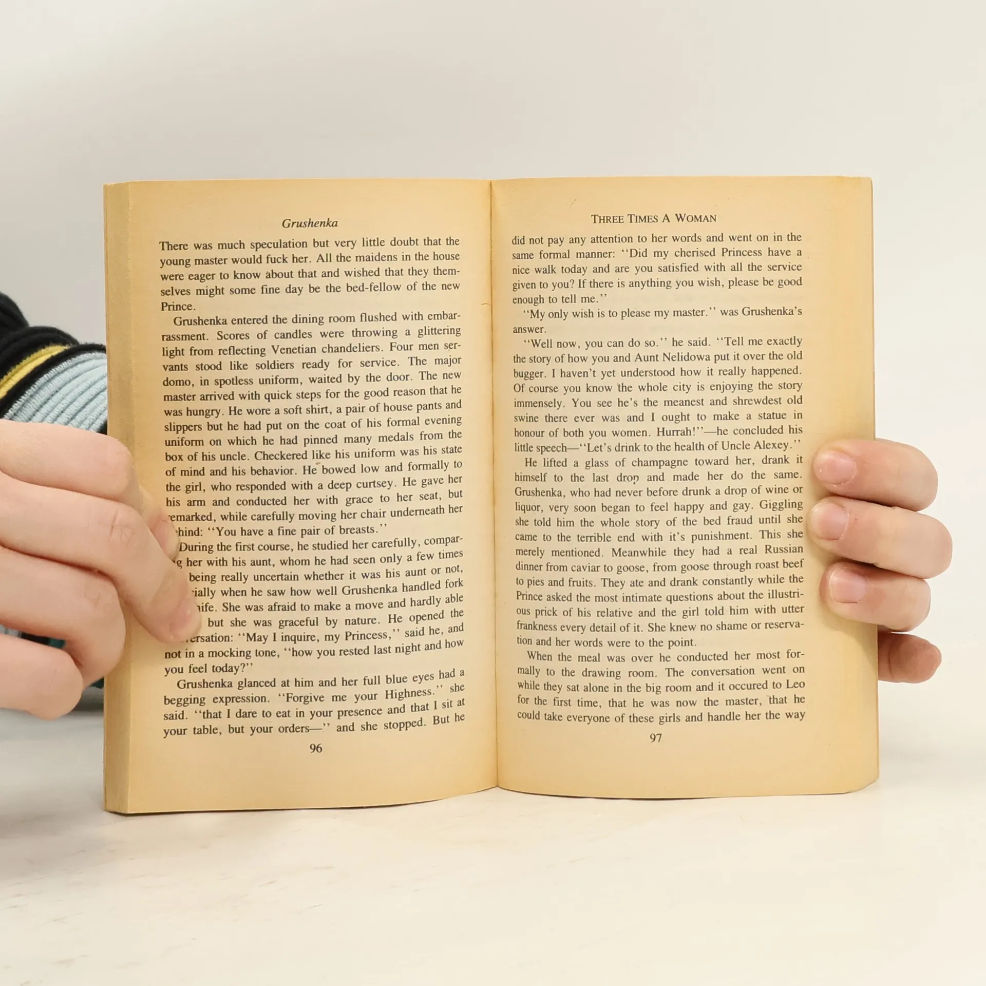 Three Times a Woman occupies a special place in the annals of erotica because of its quality. While the intent of the novel is to expose the absolute licentiousness in Russia under the czars by recording the sexual fate of the beautiful serf girl Grushenka, the author's sense of character and development is artful. The narrative gift invests the exploits of the characters with rare authenticity. We first meet our heroine when, because of her remarkable resemblance to a young noblewoman, she is purchased to be a stand-in for the lady whenever the lady's husband demands his conjugal rights. The ruse is soon discovered however, the Grushenka, now skilled in the technique of lovemaking, is forcibly passed on to the ne're-do-well nephew of the tricked husband. A few illicit encounters and a kidnapping later, she finds herself imprisoned in a special kind of Moscow bordello which caters to the unusual tastes of the country's aristocrats, both male and female. She subsequently falls in love and makes her way to the sensual world of 18th century Paris, later returning to Moscow for all sorts of adventures. All in all, this is a work to be savored by the discriminating reader.