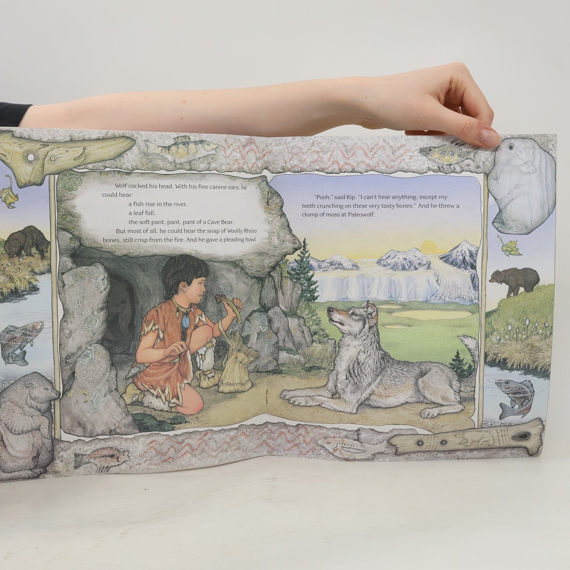 Kip the Cave Boy offers to share all his woolly rhino ribs if Paleowolf will use his keen nose, fine ears, and sharp eyes to keep Kip from being eaten up. When Paleowolf agrees with a bark and a wag of his tail, Kip names his new friend Dog.