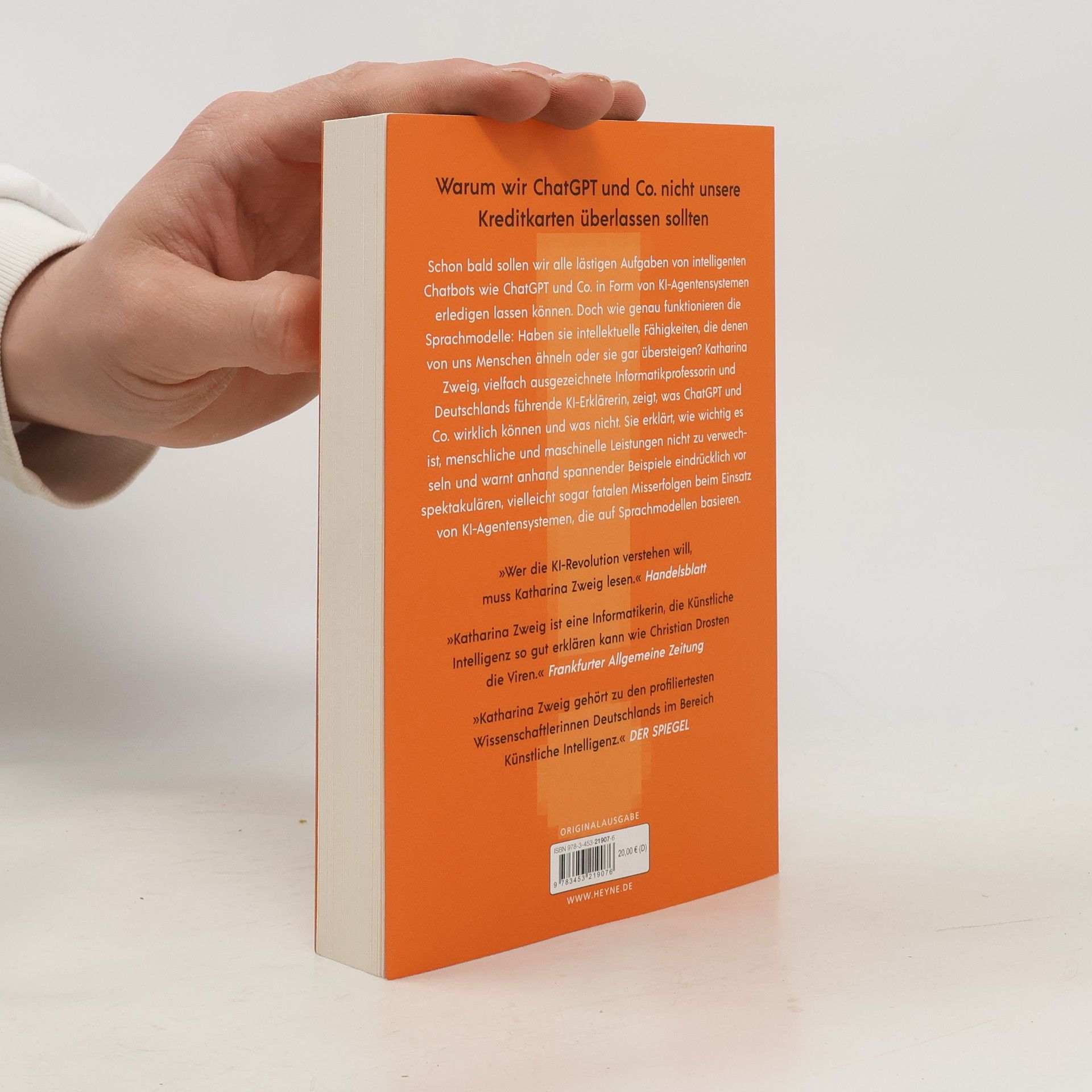 Warum Sie nicht ChatGPT und Co. Ihren Urlaub buchen lassen sollten Wie genau funktionieren ChatGPT und andere große Sprachmodelle? Haben sie intellektuelle Fähigkeiten, die die von uns Menschen schon heute übersteigen? Oder sind sie nur Papageien, die nachplappern, was Menschen ihnen beigebracht haben? Katharina Zweig, vielfach ausgezeichnete Informatikprofessorin und Deutschlands führende KI-Erklärerin, zeigt, was ChatGPT und Co. wirklich können und was nicht. Sie erklärt, ob diese Sprachmodelle tatsächlich zusammenfassen, vergleichen, analysieren, bewerten oder unsere Fehler korrigieren können – und wie man sie am besten einsetzt. Und wo die Gefahren ihrer neuen Funktionen, KI-Agenten – Programme, die autonom Aufgaben im Web für Nutzende erledigen –, liegen. Denn Entscheidungen müssen weiterhin von uns Menschen getroffen werden, nicht von der KI. Ausstattung: mit s/w-Illus. im Text