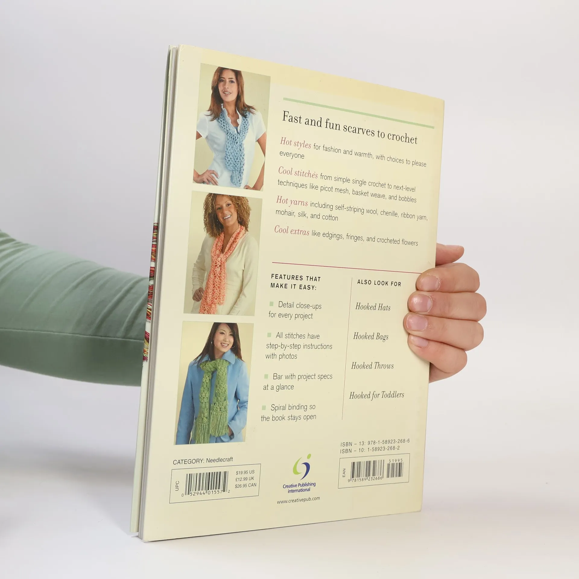 Contemporary crochet projects for fun, fast, fashionable scarves.Most beginning crocheters start with scarves because these projects are quick, easy, and stylish. People who crochet continue to make lots and lots of scarves, especially when they want to indulge in special yarns. The many crafters discovering or already hooked on crochet will find the contemporary scarf projects they're looking for in Hooked Scarves. Here are 20 original designs bursting with color, texture, and fashion style. The collection includes gorgeous scarves for fashion, cozy scarves for winter, and elegant wraps for evening. The projects use widely available yarns including popular novelty yarns. Color photographs show the finished projects, the stitches close up, the yarn used, and how to make the crochet stitches step by step. Other features include a handy ruler inside the cover and a covered spiral binding. Hooked Scarves joins an exciting series of crochet project books.
