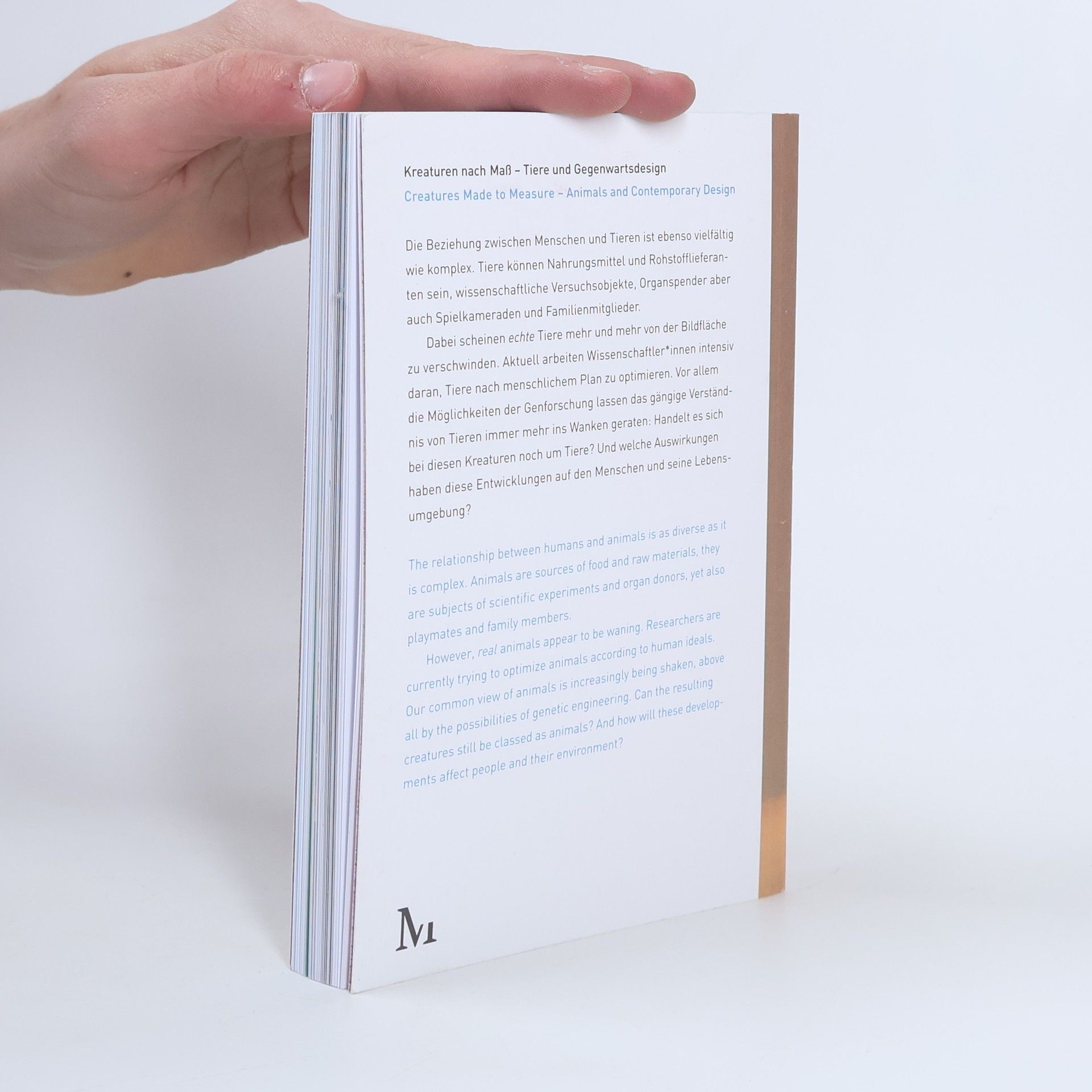 Tiere sind seit jeher Begleiter des Menschen – ob als Nahrungsmittel, Arbeitskraft oder als soziale Gefährten. Während die Anzahl der Haustiere und Serviceangebote für Vierbeiner jährlich steigen, verschwinden „echte“ Tiere immer weiter aus dem Blickfeld. So können Tiere heute nahezu ganz nach der Vorstellung des Menschen optimiert werden: Sie entstehen im Labor, werden als Organspender gezüchtet und ihr Fleisch wächst in einer Petrischale heran. Wie verändern sich dadurch die gängigen Auffassungen von Tieren? Die Designer- und Künstler*innen der Publikation begeben sich auf die Suche nach dem „richtigen Maß“ der Gestaltung dieser Kreaturen. Dabei spielen sie Möglichkeiten der Mensch-Tier-Beziehung durch und entwerfen zugleich Szenarien einer anderen Zukunft. Künstler: Martin Avila, BLESS, Melanie Bonajo, The Center for Genomic Gastronomy, Kurzgesagt - In a Nutshell, Center for PostNatural History, Marcus Coates, Thalia de Jong, Aleksandra Domanovic, Konstantin Grcic, Christine Herdin/Katharina Wahl, Max Kosoric/Sanne Pawelzyk, Silvia Knüppel, Dietrich Luft, Christien Meindertsma, Next Nature Network, Ana Rajcevic, Veronica Ranner, Peter Schäfer, Johanna Schmeer, Susana Soares, Sputniko, ThreeASFOUR, Thomas Thwaites, Marije Vogelzang, Pinar Yoldas