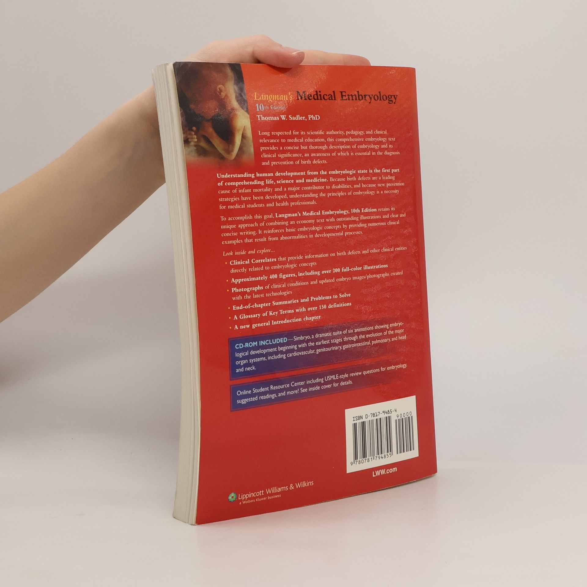 Long respected for its scientific authority, pedagogy, and clinical relevance to medical education, this comprehensive embryology text features outstanding illustrations and clear and concise writing. The brand-new Tenth Edition covers all aspects of embryology of interest to medical students and instructors and includes clinical correlates that provide information on birth defects and other clinical entities directly related to embryologic concepts. This extensively revised edition features new full-color photographs of clinical conditions and updated embryo images/photographs created using newer technologies. It also features new online USMLE-style review questions through Connection / The Point. A new introduction chapter on development includes molecular biology. This edition's larger page size improves readability. A bound-in CD-ROM, Simbryo , presents animations of embryologic system development.