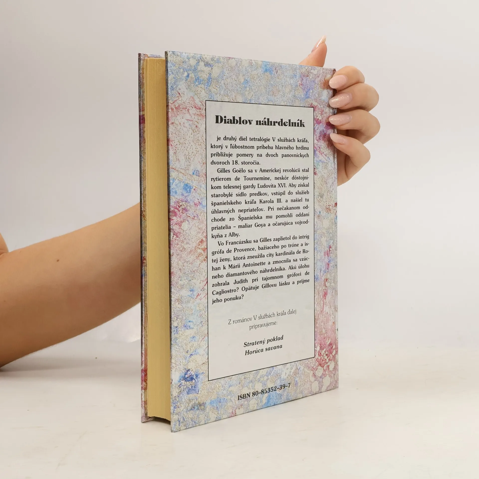 V službách kráľa 2. Diablov náhrdelník je druhý diel tetralógie V službách kráľa, ktorý v ľúbostnom príbehu hlavného hrdinu približuje pomery na dvoch panovníckych dvoroch 18. storočia. Gilles Goelo sa v Americkej revolúcii stal rytierom do Tournemine, neskôr dôstojníkom telesnej gardy Ľudovíta XVI. Aby získal starobylé sídlo predkov, vstúpil do služieb španielskeho kráľa Karola III. a našiel tu úhlavných nepriateľov. Pri nečakanom odchode zo Španielska mu pomohli oddaní priatelia - maliar Goya a očarujúca vojvodkyňa z Alby. Vo Francúzsku sa Gilles zaplietol do intríg grófa de Provence, bažiaceho po tróne a istej ženy, ktorá zneužila city kardinála de Rohan k Márii Antoinette a zmocnila sa vzácneho diamantového náhrdelníka. Akú úlohu zohrala Judith pri tajomnom grófovi de Cagliostro? Opätuje Gillovu lásku a prijme jeho ponuku?