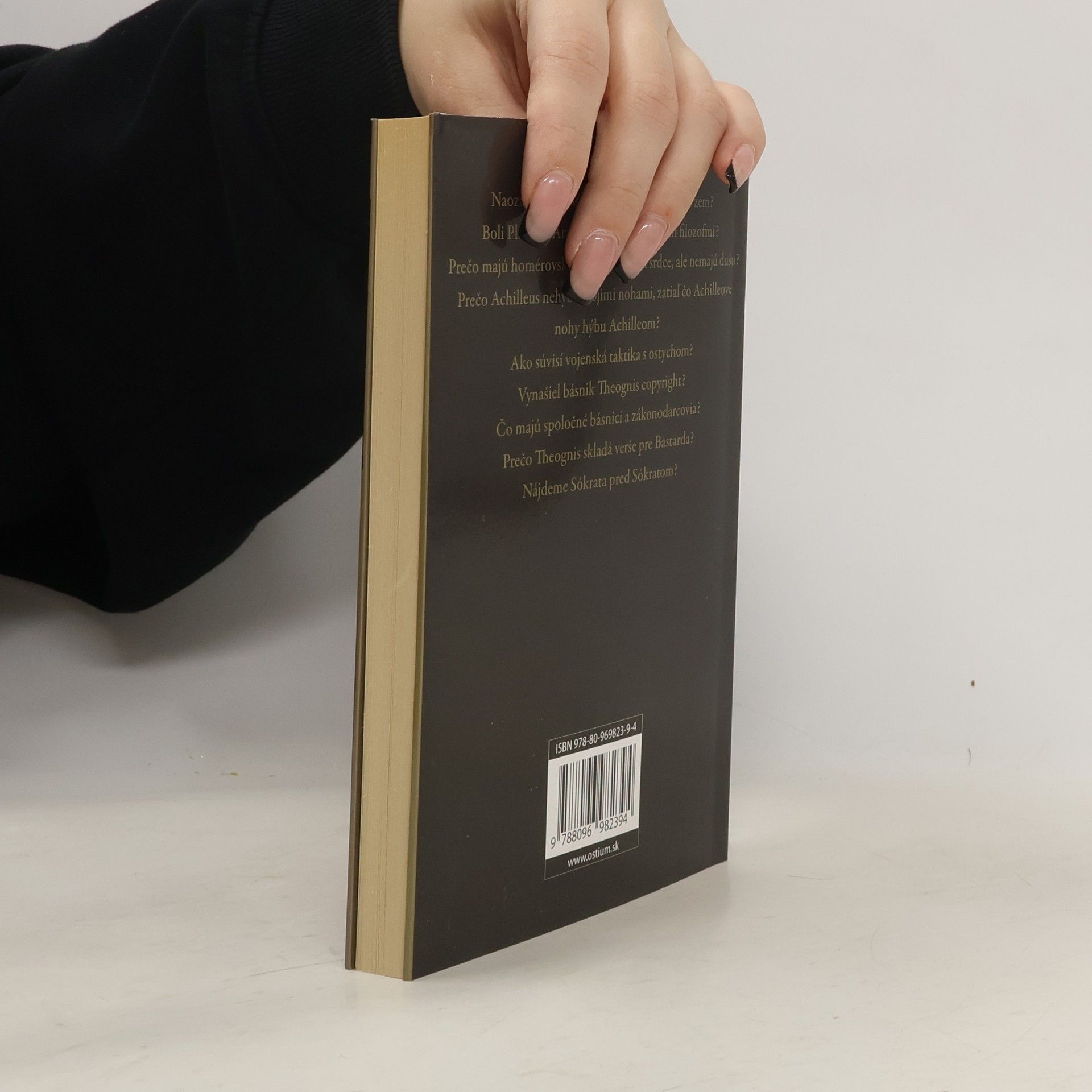Naozaj zniesol Sókratés filozofiu z neba na zem? Boli Platón a Aristotelés vždy najväčšími filozofmi? Prečo majú homérovskí bohovia hlavu a srdce, ale nemajú dušu? Prečo Achilleus nehýbe svojimi nohami, zatiaľ čo Achilleove nohy hýbu Achilleom? Ako súvisí vojenská taktika s ostychom? Vynašiel básnik Theognis copyright? Čo majú spoločné básnici a zákonodarcovia? Prečo Theognis skladá verše pre Bastarda? Nájdeme Sókrata pred Sókratom?