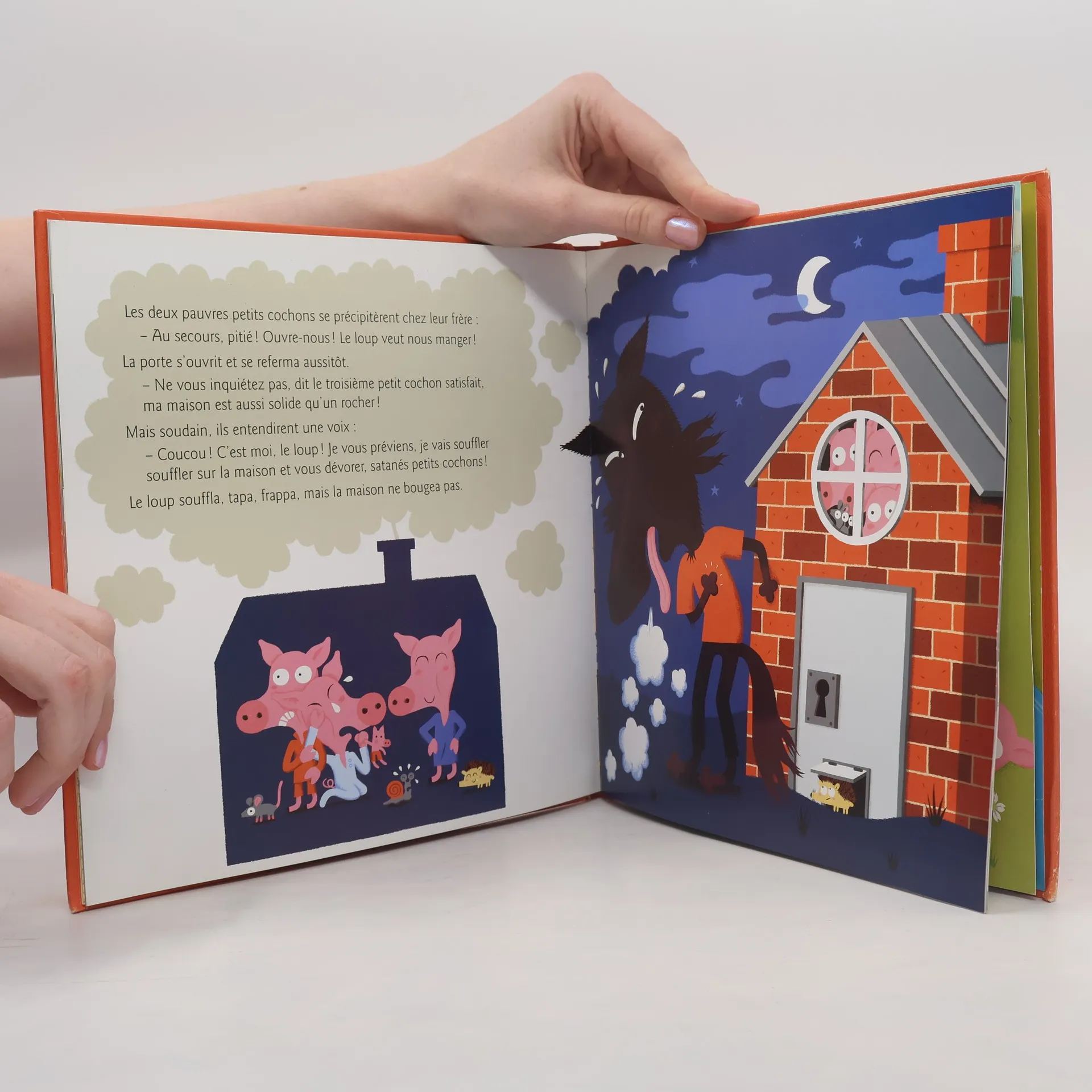 Il etait une fois trois petits cochons qui voulaient construire leurs maisons. Le premier construisit sa maison avec de la paille, le deuxieme avec du bois, et le troisieme avec des briques. Les deux freres du troisieme petit cochon se moquerent de lui, mais, quand le loup vint a souffler sur leurs maisons pour les faire voler en eclats, ils furent bien contents d'aller trouver refuge dans la maison de briques?