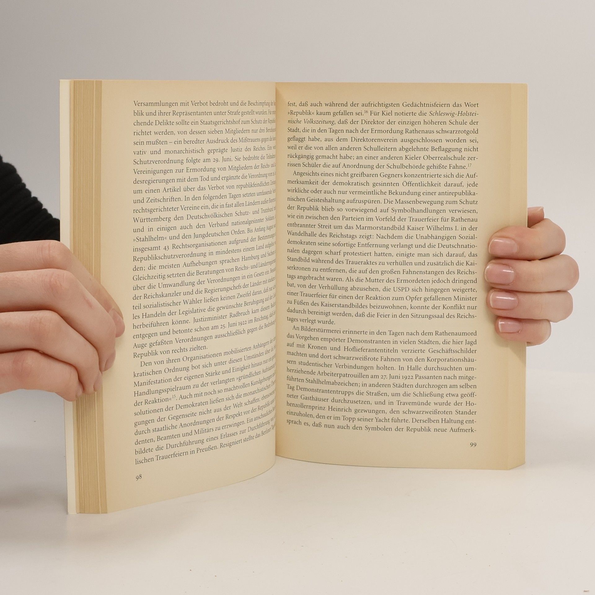 Die damals noch junge Republik von Weimar wurde durch die Attentats-Serie der Jahre 1921/22 fundamental erschüttert: Die Opfer waren der Reichsfinanzminister M. Erzberger, der Kasseler Oberbürgermeister Ph. Scheidemann, der Industrielle und Außenminister W. Rathenau und der Publizist M. Harden. Hinter diesen Morden standen politische und (para-)militärische Organisationen, die die alte Vorkriegsordnung mit allen Mitteln wiederherstellen wollten.