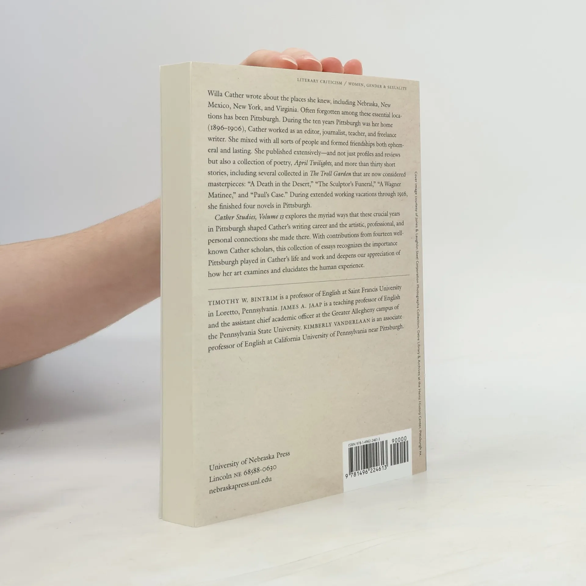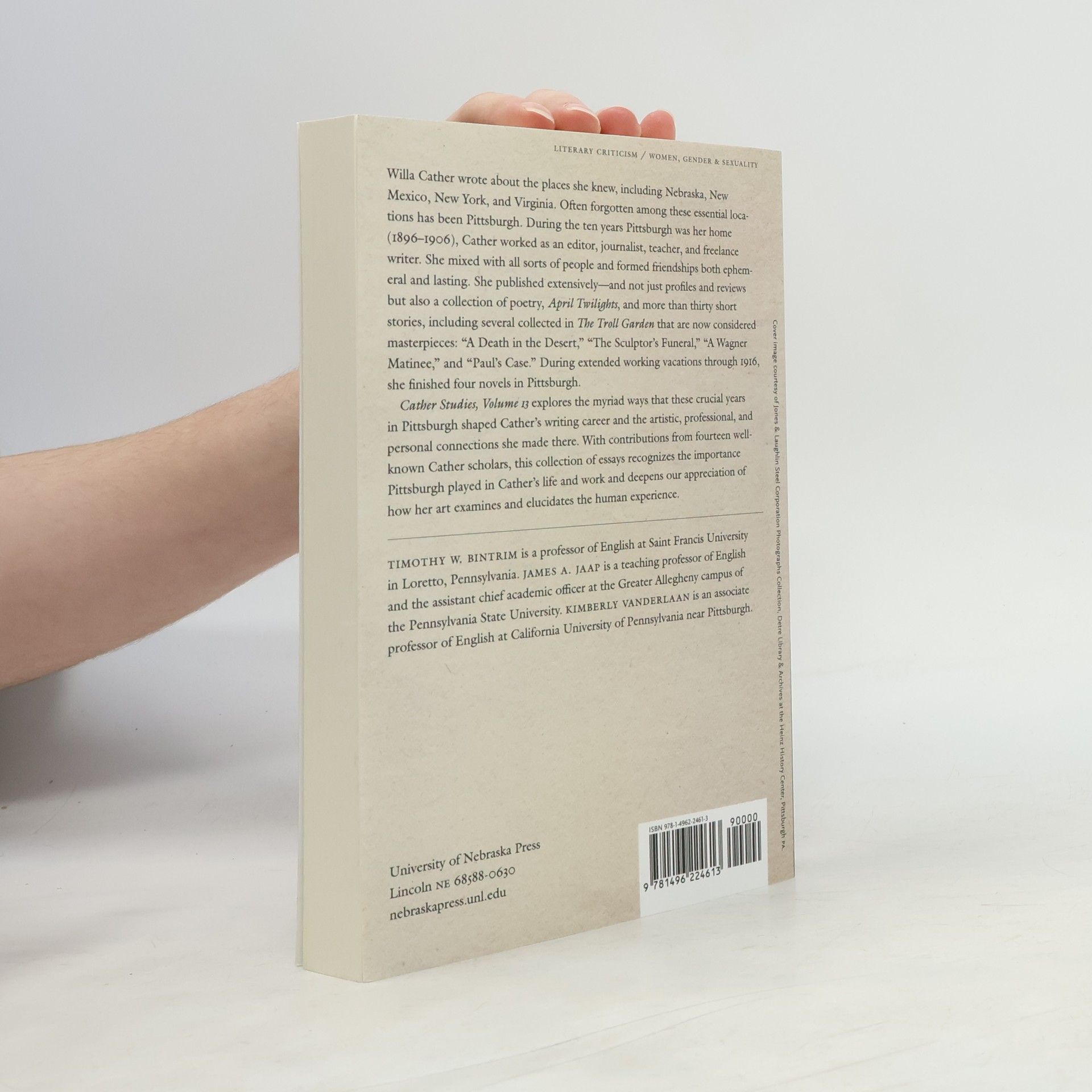 Willa Cather wrote about the places she knew, including Nebraska, New Mexico, New York, and Virginia. Often forgotten among these essential locations has been Pittsburgh. During the ten years Pittsburgh was her home (1896–1906), Cather worked as an editor, journalist, teacher, and freelance writer. She mixed with all sorts of people and formed friendships both ephemeral and lasting. She published extensively—and not just profiles and reviews but also a collection of poetry, <i>April Twilights</i>, and more than thirty short stories, including several collected in <i>The Troll Garden</i> that are now considered masterpieces: “A Death in the Desert,” “The Sculptor’s Funeral,” “A Wagner Matinee,” and “Paul’s Case.” During extended working vacations through 1916, she finished four novels in Pittsburgh. <i>Cather Studies, Volume 13</i> explores the myriad ways that these crucial years in Pittsburgh shaped Cather’s writing career was and the artistic, professional, and personal connections she made there. With contributions from fourteen well-known Cather scholars, this collection of essays recognizes the importance Pittsburgh played in Cather’s life and work and deepens our appreciation of how her art examines and elucidates the human experience.