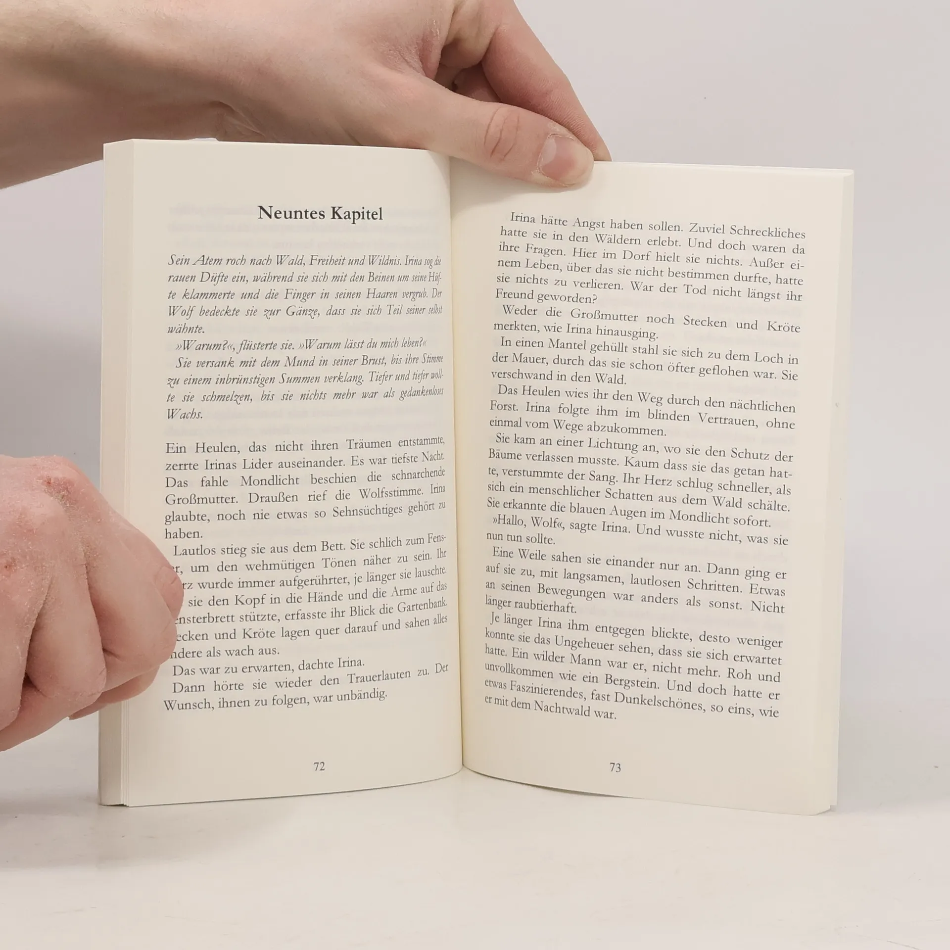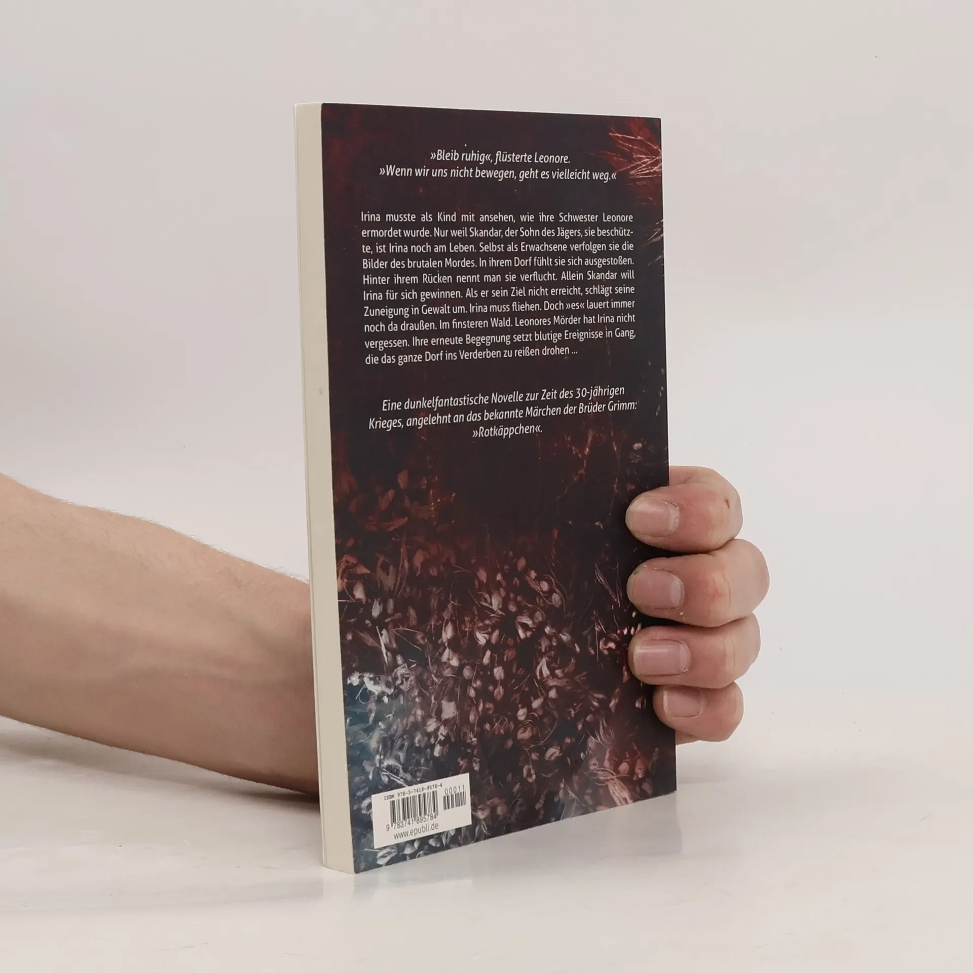 Irina erlebt als Kind den Mord an ihrer Schwester Leonore und wird von Skandar gerettet. Als Erwachsene wird sie von der Vergangenheit verfolgt und fühlt sich im Dorf verstoßen. Skandars Liebe schlägt in Gewalt um, und Irina muss fliehen. Ihre Rückkehr löst blutige Ereignisse aus, die das Dorf bedrohen. Dunkelfantastische Novelle zur Zeit des 30-jährigen Krieges, inspiriert von „Rotkäppchen“.