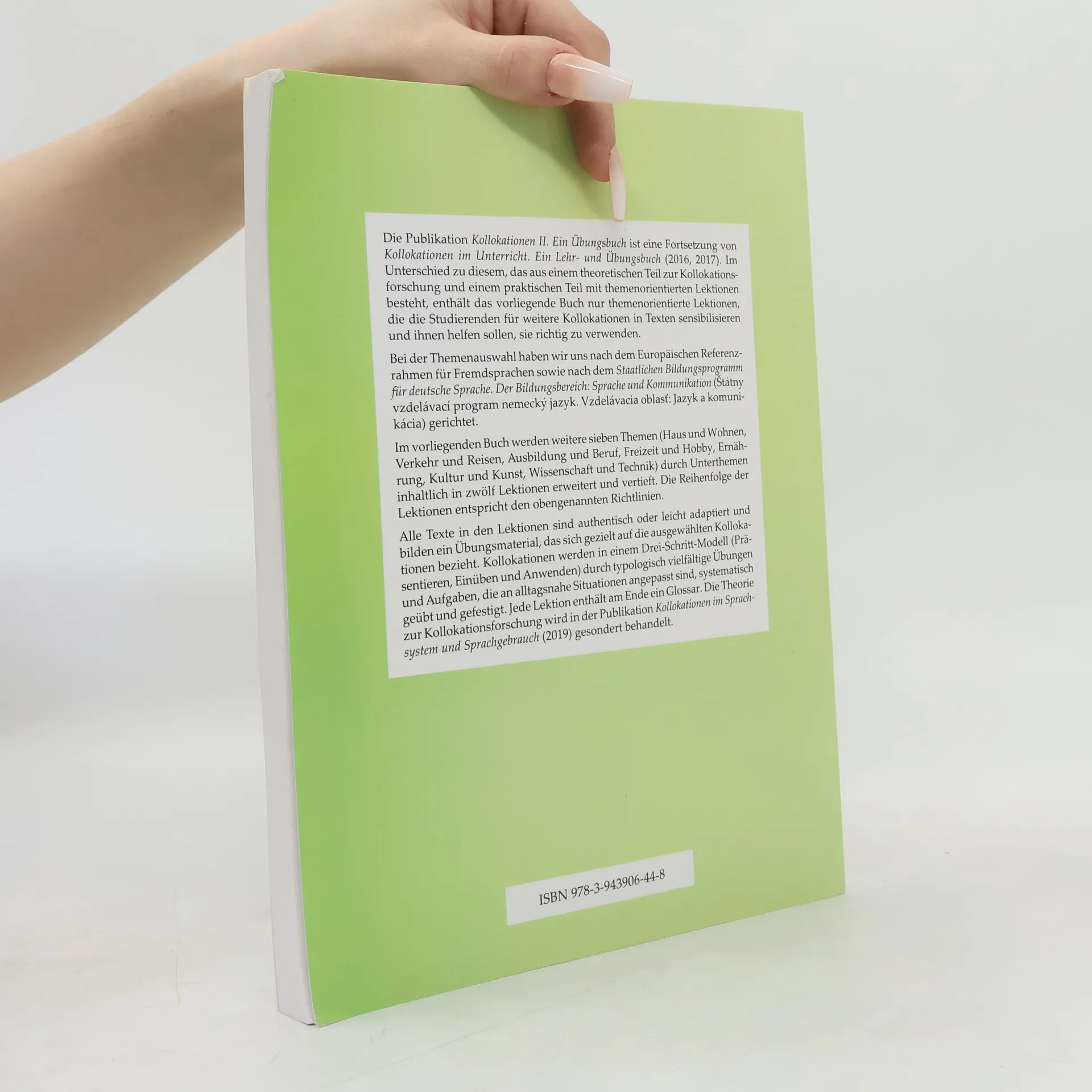 Die Publikation Kollokationen II. Ein Übungsbuch ist eine Fortsetzung von Kollokationen im Unterricht. Ein Lehr- und Übungsbuch. Im Unterschied zu diesem, das aus einem theoretischen Teil zur Kollokationsforschung und einem praktischen Teil mit themenorientierten Lektionen besteht, enthält das vorliegende Buch nur themenorientierte Lektionen, die die Studierenden für weitere Kollokationen in Texten sensibilisieren und ihnen helfen sollen, sie richtig zu verwenden. Bei der Themenauswahl haben sich die Autoren nach dem Europäischen Referenzrahmen für Fremdsprachen sowie nach dem Staatlichen Bildungsprogramm für deutsche Sprache. Der Bildungsbereich: Sprache und Kommunikation gerichtet. Im vorliegenden Buch werden weitere sieben Themen (Haus und Wohnen, Verkehr und Reisen, Ausbildung und Beruf, Freizeit und Hobby, Ernährung, Kultur und Kunst, Wissenschaft und Technik) durch Unterthemen inhaltlich in zwölf Lektionen erweitert und vertieft.