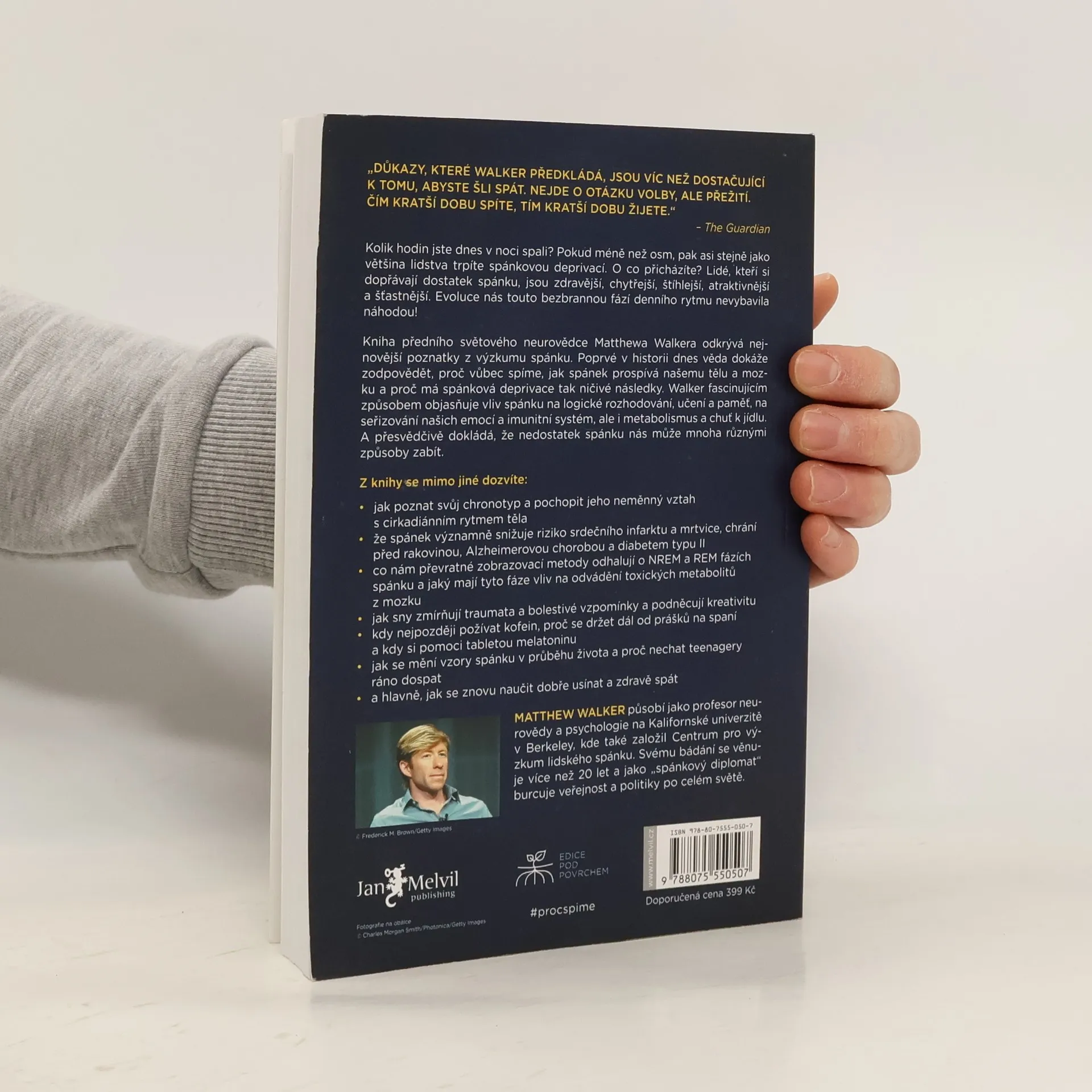 Co kdybyste zjistili, že elixír mládí, krásy, zdraví a dobré nálady spočívá v kvalitním spánku? Profesor neurologie a psychologie Matthew Walker z Berkeley prozkoumal tajemství spánku a jeho klíčový vliv na náš život. Klade otázku, proč příroda nutí všechny živočichy trávit tolik času v bezbranném stavu, a odpověď je jasná: spánek přináší nespočet evolučních výhod, které zajišťují naši existenci. Po přečtení této knihy se neodvážíte svůj spánek zanedbávat. Mnozí považují spánek za ztrátu času, přičemž média často podceňují jeho význam. Walker upozorňuje, že osm hodin spánku je pro většinu lidí minimem, a přibližně osmdesát procent populace žije ve spánkové deprivaci. Důkazy o negativních dopadech nedostatku spánku na jednotlivce i společnost jsou v knize shrnuty. Kvalitní spánek přináší výhody jako efektivní učení, logické myšlení a vyrovnání emocí. Podporuje imunitu, metabolismus a reguluje chuť k jídlu. Důležité jsou i sny, které zpracovávají emocionální zážitky a podporují kreativitu. Walker se také zabývá vlivem alkoholu a kofeinu na spánek, změnami spánkových rytmů v různých životních fázích a radami, jak zlepšit spánek a potlačit nespavost. Kniha apeluje na firmy a vlády, aby začaly spánek vnímat jako klíčový faktor zdraví a pracovního výkonu.