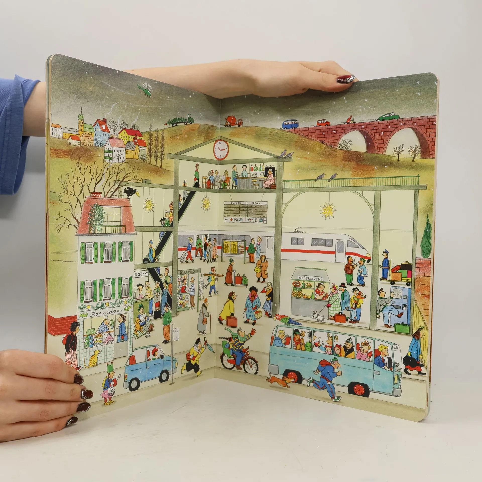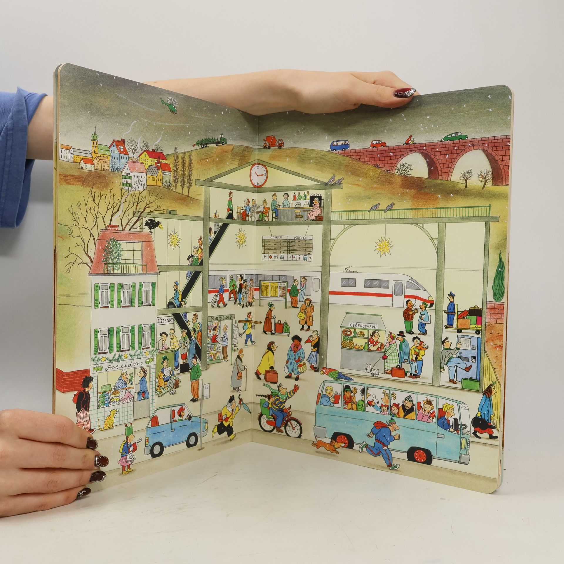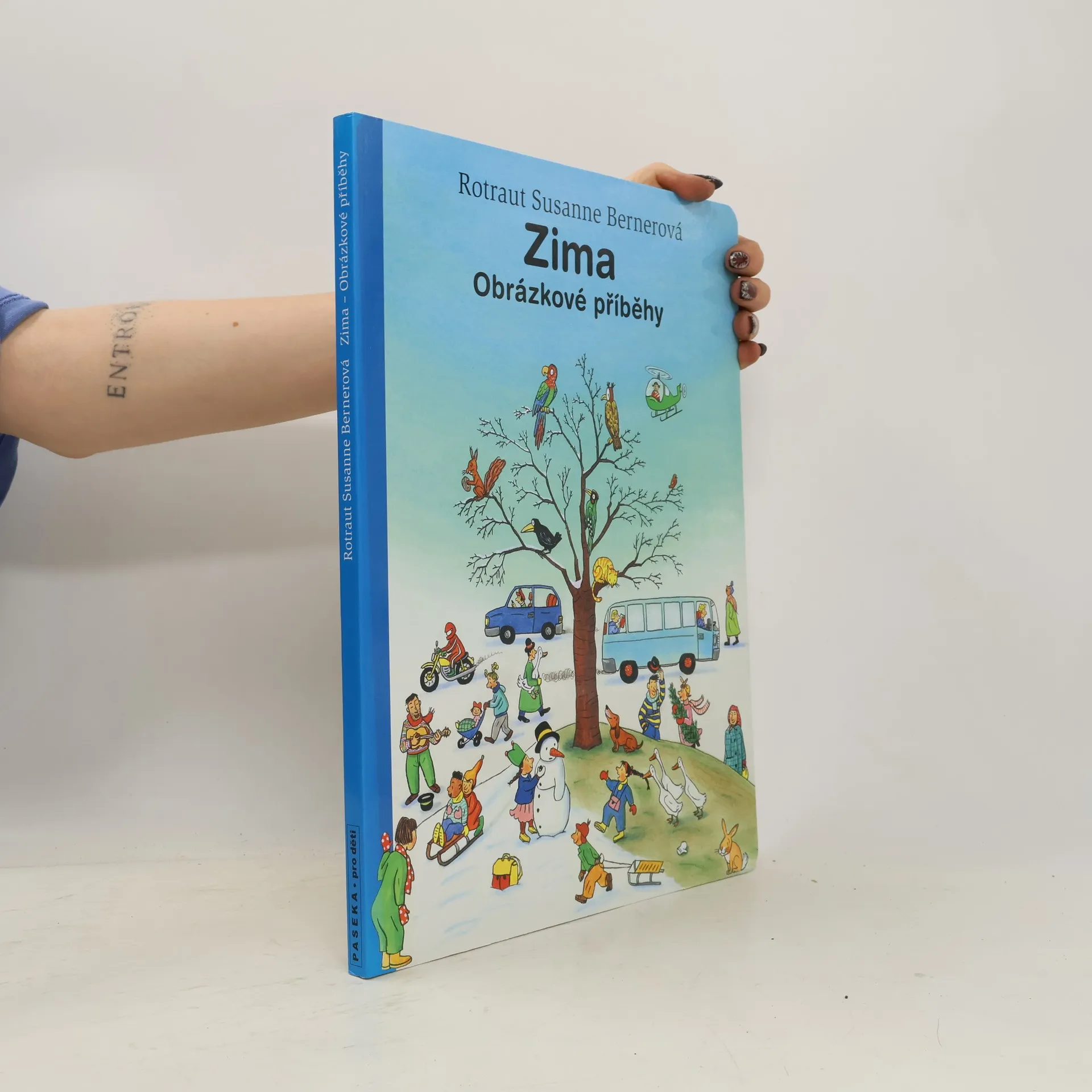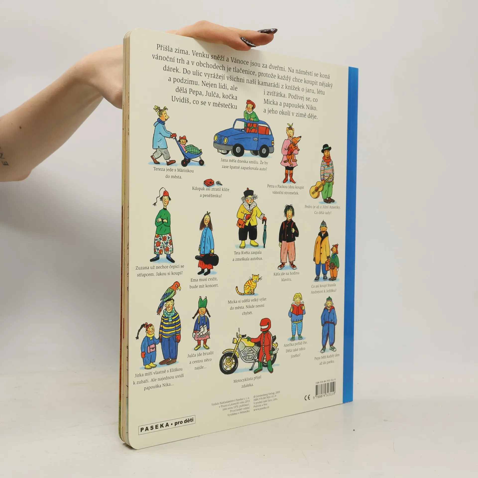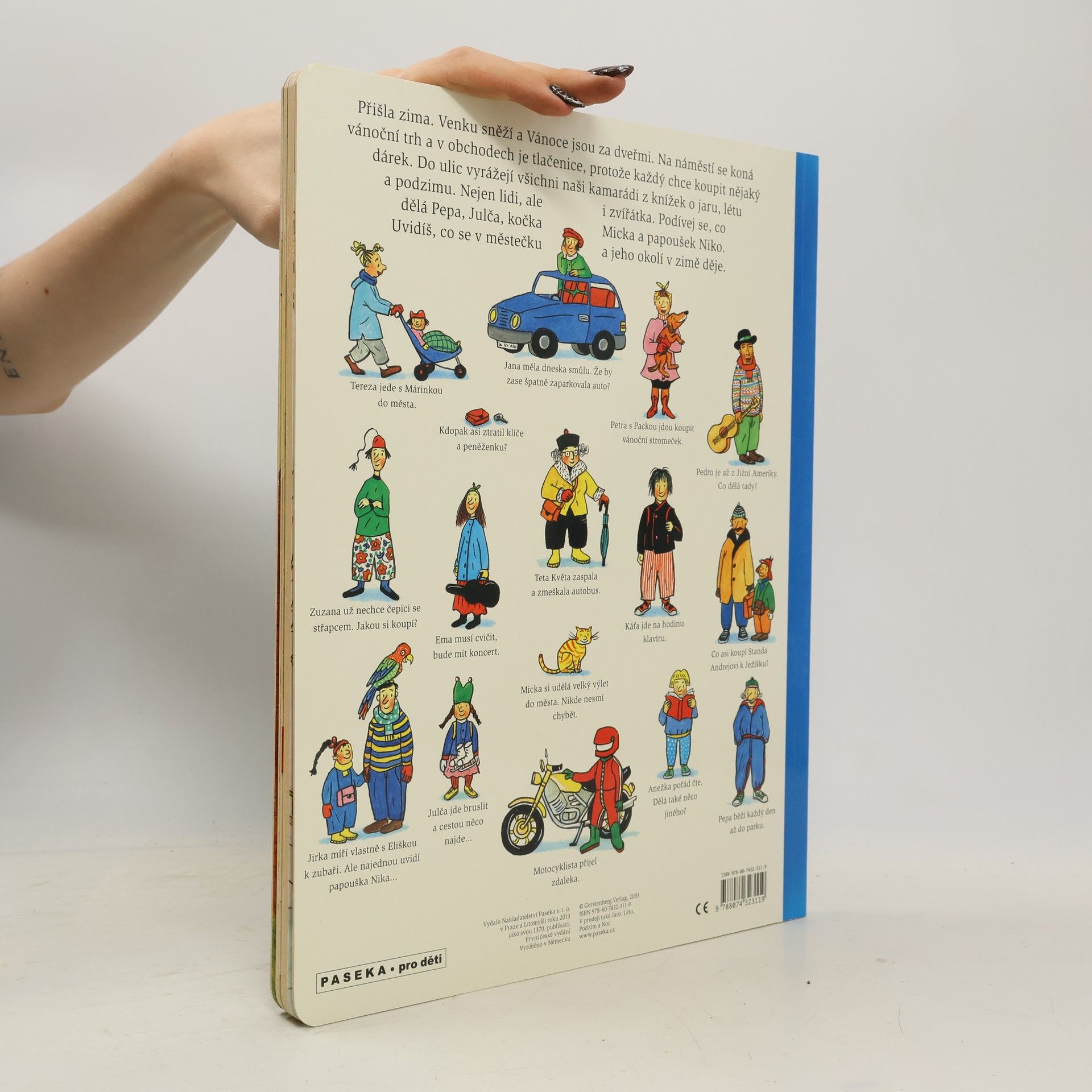 Po knížce o jaru, létu a podzimu přichází Zima. Rotraut Suzanne Bernerová na obrázcích znovu vypráví své malé, vtipné příběhy všedního dne, které poutají a bystří pozornost, podněcují fantazii a řečové schopnosti, ale hlavně baví malé i větší děti. V předvánoční atmosféře se opět setkáte s některými starými známými a kamarády z předchozích tří úspěšných knížek. Přibudou další postavy, věci a zvířátka. Jen místo zůstává stejné: město s ulicemi, domy, s tržištěm, obchody, k tomu park a nedaleký statek. Podívejte se, co všechno se v Zimě děje!