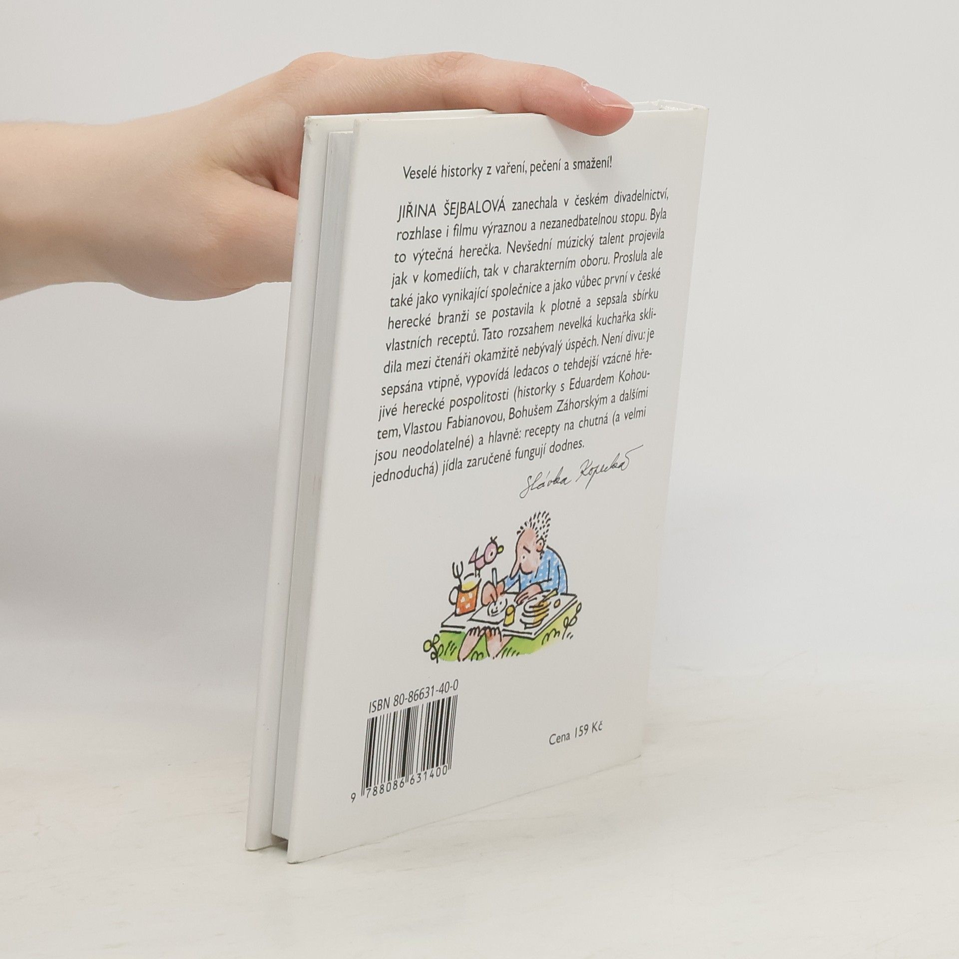Paní Jiřina Šejbalová zanechala v českém divadelnictví i filmu významnou a nezanedbatelnou stopu. Byla to výborná herečka, ale proslula také jako vynikající společnice a kuchařka a sepsala sbírku svých vlastních receptů. Tato rozsahem nevelká kuchařka sklidila mezi čtenáři nebývalý úspěch. Je sepsaná vtipně, vypovídá leccos o tehdejší herecké pospolitosti (historky s Eduardem Kohoutem, Vlastou Fabiánovou, Bohušem Záhorským a dalšími jsou neodolatelné) a hlavně obsahuje recepty na chutná a jednoduchá jídla .... celý text