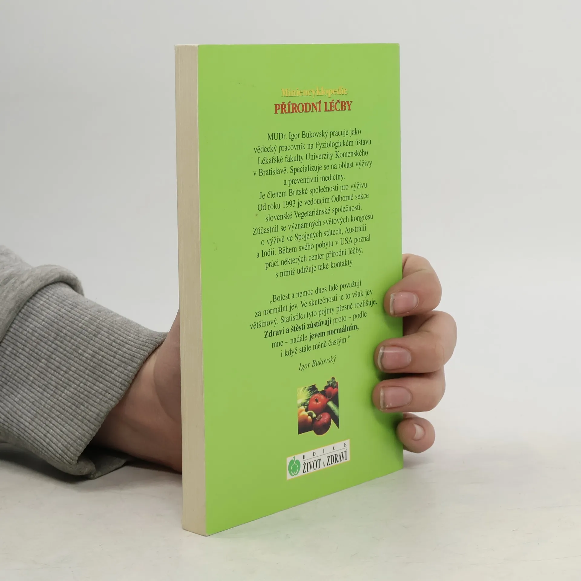 Igor Bukovský. MUDr. Igor Bukovský je odborným asistentem a vědeckým pracovníkem Fyziologického ústavu Lékařské fakulty v Bratislavě. Výživou a preventivním lékařstvím se zabývá od roku 1990. Od r. 1991 se pravidelně účastní všech významných evropských a světových kongresů o výživě a fyziologii člověka. Od r. 1990 veřejně přednáší a publikuje. Je autorem řady rozhlasových a televizních pořadů a novinových článků. Napsal knihy Hledá se zdravý člověk a Vegetariánské dítě. Je členem Britské společnosti pro výživu, Americké společnosti pro klinickou výživu a několika domácích odborných společností. Výzkumná práce dr. Bukovského je zaměřena na vliv oxidací a antioxidantů na raná stadia aterosklerózy. Knížka chce být přehledným a stručným návodem, jak léčit některá častá onemocnění - stravou, úpravou stylu života, bylinkami a zeleninovými šťávami nebo u nás ještě málo známou vodoléčbou. Ze slovenského originálu "Miniencyklopédia prírodnej liečby" přeložila Marta Bártová. Foto MICHAEL PHOTOBANK. Vydání třetí.